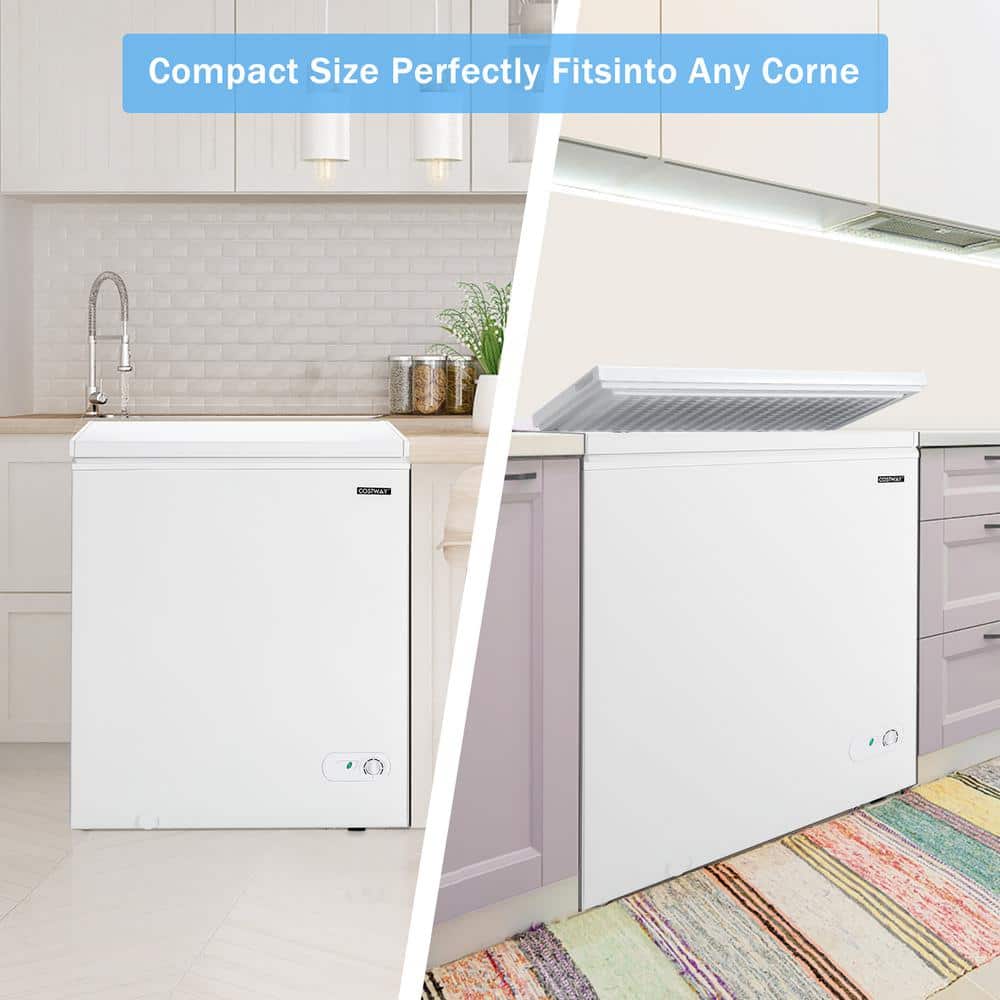 Our 5.0 cu. ft. chest freezer will be your best choice. Its internal capacity is large enough to hold all kinds of frozen foods and bulky ingredients, including turkeys, ribs and pizzas. In addition, the freezer also comes with 3 storage baskets, which can store items in an orderly manner and effectively use the space, allowing you to find what you need quickly. And you can adjust the temperature by the bottom knob or turn off the compressor for manual defrosting. What's more, its simple appearance and compact size are suitable for various limited spaces, such as dormitories, office lounges, RVs and more, allowing you to enjoy fresh food anytime and anywhere.