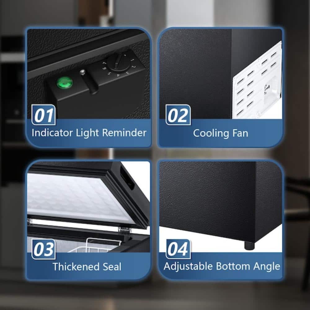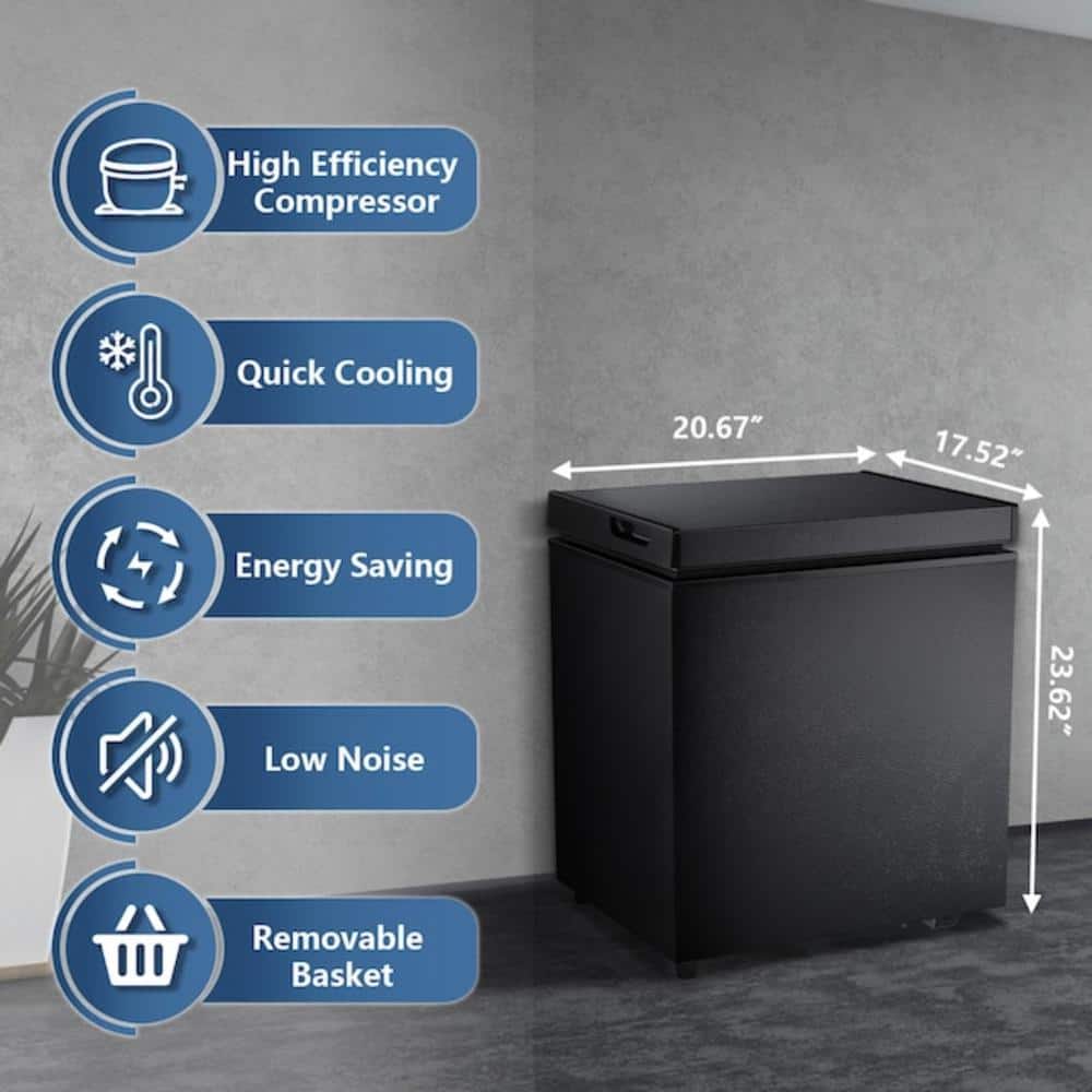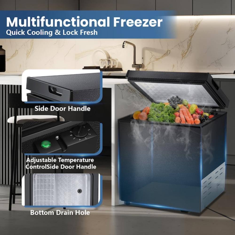 COWSAR 1.8 Cu. Ft. Chest Freezer offers the space to accommodate all your storage needs. Perfect for stocking up on frozen food such as meat, pizza, fruits and vegetables, ice cream, ice, and more this reliable chest freezer has a quick-freezing system with a mechanical temperature control that is easily accessible. The convenient and removable storage basket allows you to store the small things you don't want to get lost. The compact Freezer is suitable for dorm rooms, office break rooms, RVs, and bars.
