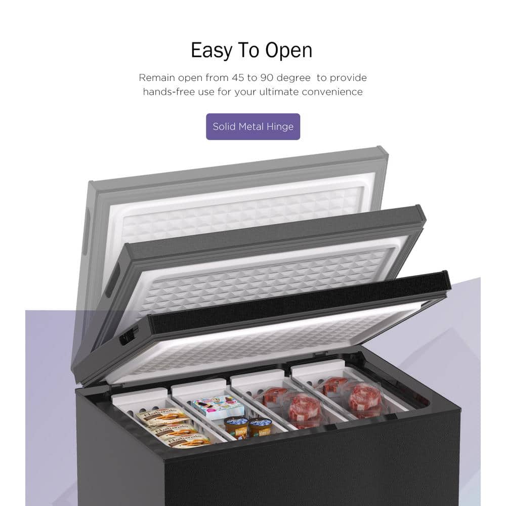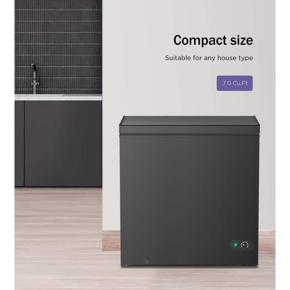 Place your frozen food in this chest freezer. The compact size and free-standing design make it perfect for small spaces. For ample storage, it offers a 7.0 cu. ft. capacity. A top door provides easy access. An adjustable thermostat and a manual defrost allow you temperature control. To add a smooth look, it comes in a black finish.