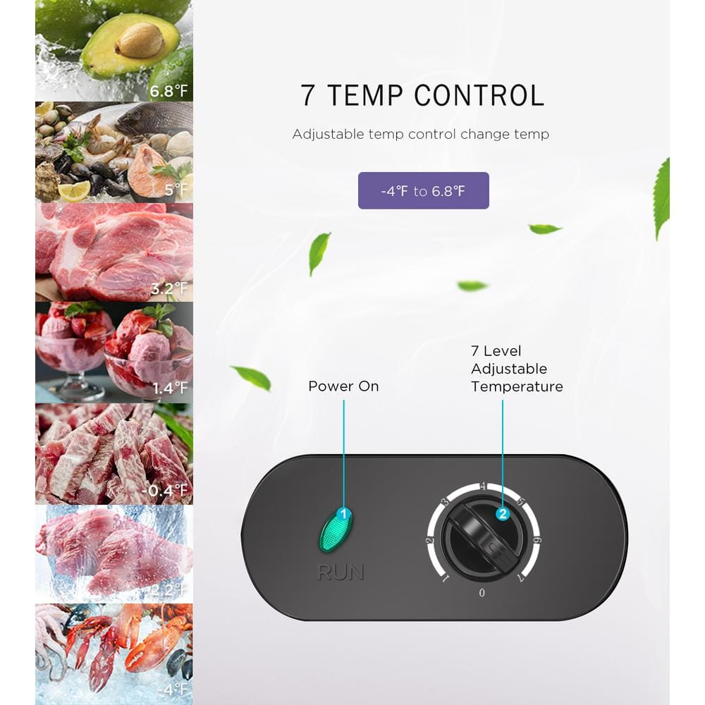 - Adjustable thermostat and manual defrost