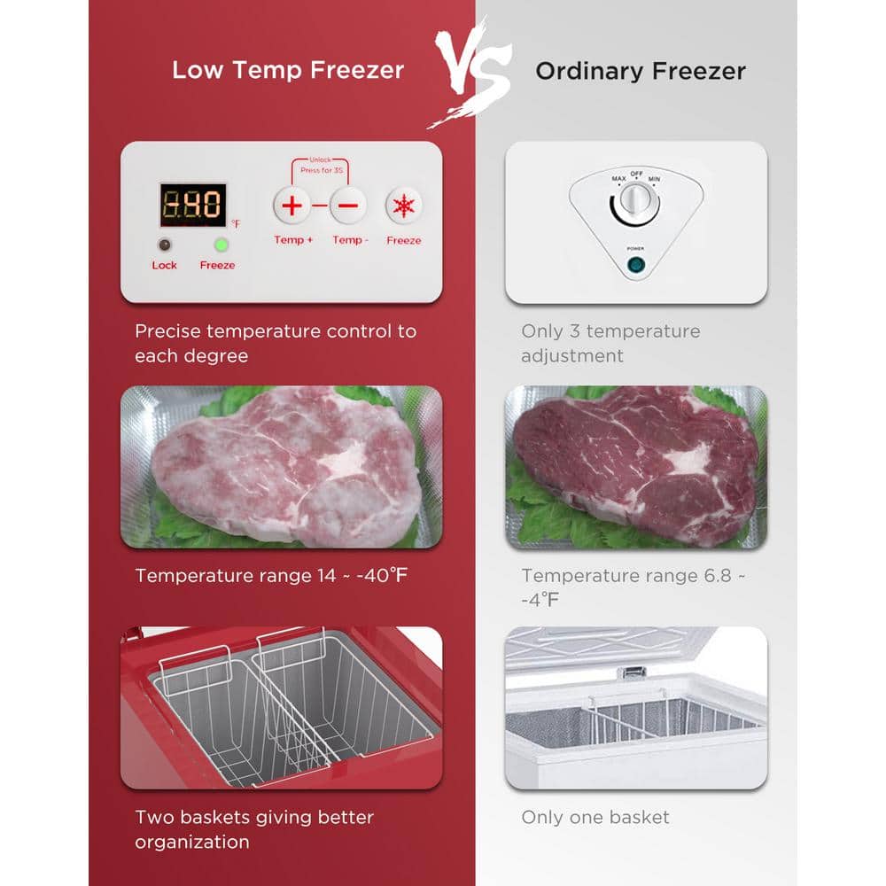 This 3.5 Cu. Ft. Chest Freezer offers the space to accommodate all your storage needs. Perfect for stocking up on frozen food such as meat, pizza, fruits and vegetables, ice cream, ice and more - this reliable chest freezer has a quick freezing system with a electronic temperature control that is easily accessible. The convenient and removable storage basket allows you to store the small things you don't want to get lost. The removable wire basket allows you to store some small foods for easy access. The drain holes with plugs are designed for easy drainage and manual defrosting. The hinged door on the top provides easy access to the freezer's contents. Our compact, quiet and energy-saving freezer takes up small space, which is perfect for any areas, such as the kitchen, living room, dormitory, office and more.