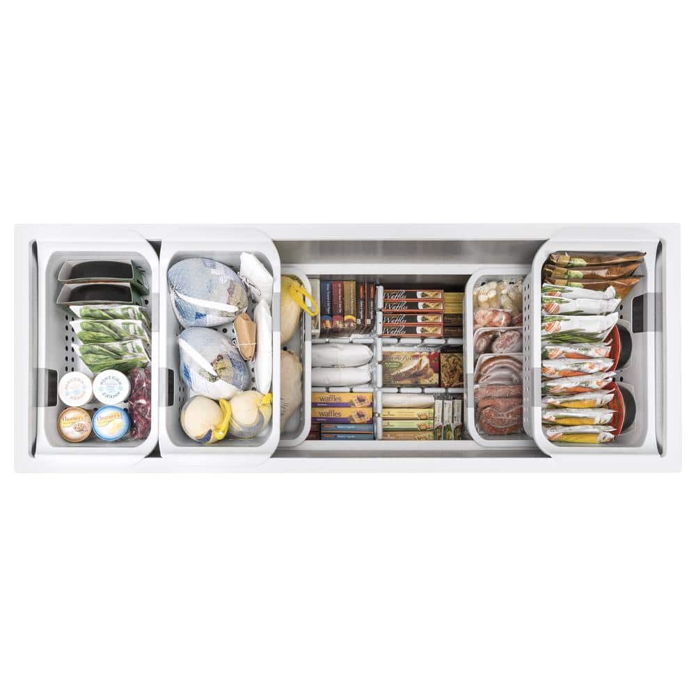 With a door that locks to help keep children out, this 21.7 cu. ft. GE Chest Freezer offers optimal storage capacity for your frozen items. This Garage Ready freezer features 5 lift out sliding bulk storage basket to help ensure that you have room to store and organize your favorite frozen foods. Its defrost water drain allows for easy defrosting.