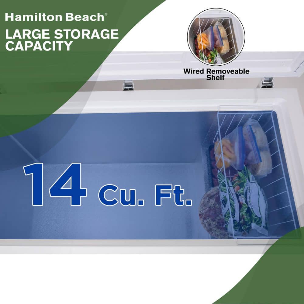 Introducing the Hamilton Beach Chest Freezer, the perfect solution for storing all of your family's favorite frozen foods and treats. With a generous 14 cu. ft. capacity, this freezer provides ample space to store everything from ice cream to frozen dinners and more. The external temperature control allows for easy and precise adjustments, without the need to open the lid and release cold air, ensuring that your food stays at the perfect temperature at all times. And with the power-on indicator light, you can have peace of mind knowing that your freezer is functioning properly. The manual defrost feature maintains a consistent freezing temperature, keeping your frozen food fresher for longer. And with the removable basket, you can easily organize and separate small items or remove it to accommodate larger items. The defrost water drain makes the defrosting process effortless, allowing you to quickly and easily remove any excess water. And with its classic white color, this freezer complements any decor, making it a stylish and functional addition to any home.