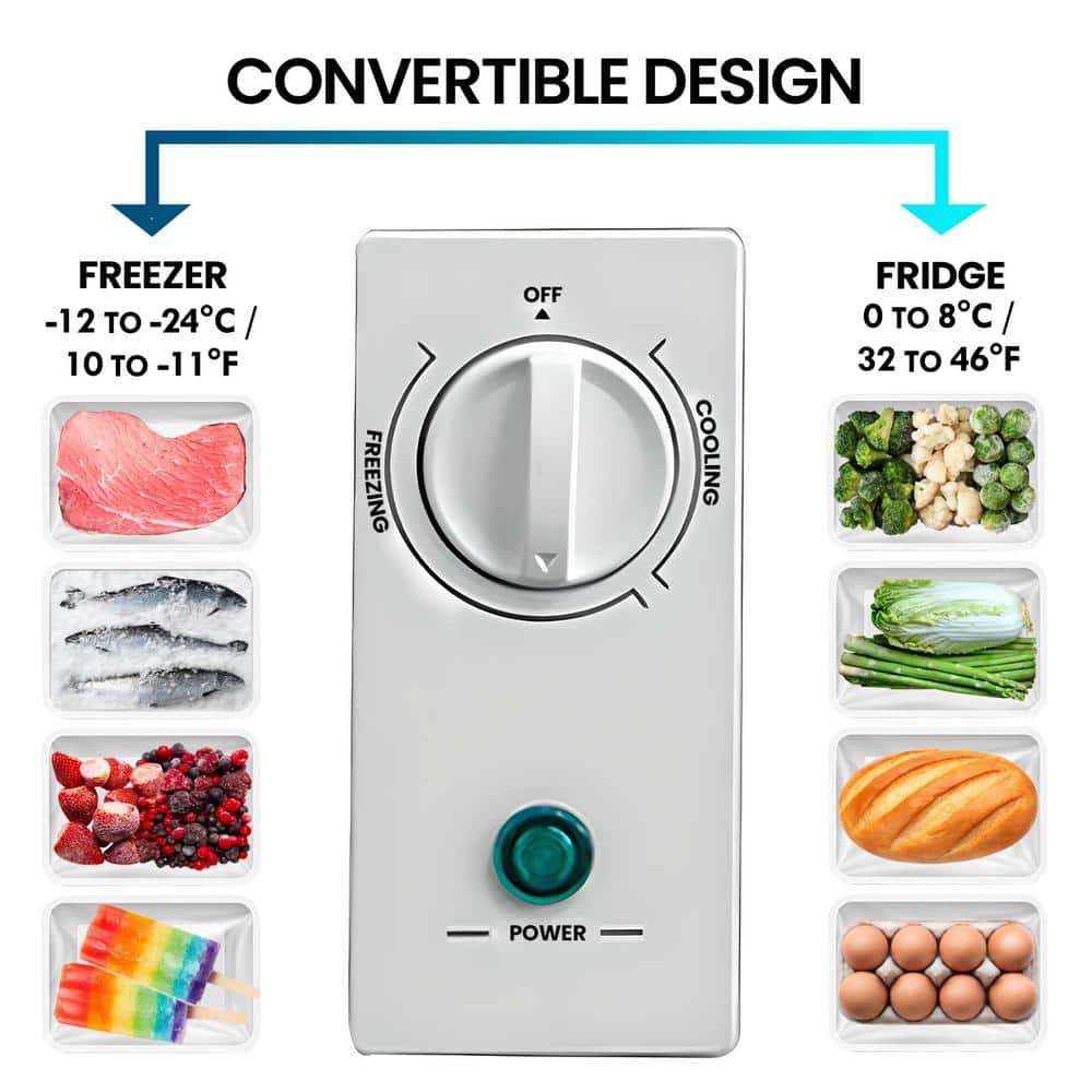 Space-saving 5 cu ft convertible refrigerator/freezer is garage-ready in freezer mode. Features external controls with simple dial thermostat & conversion between modes. Stay-open lid and easy rolling wheels provide easy access to all your contents.