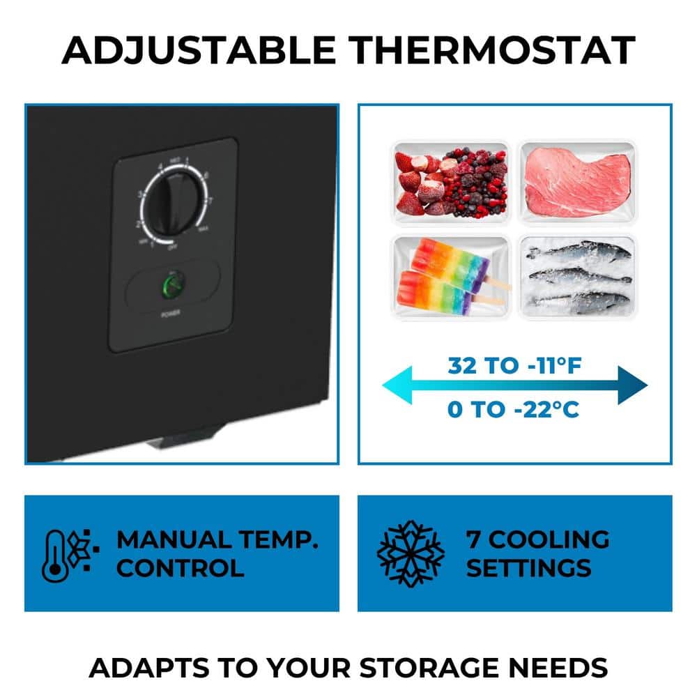 Sleek black and stainless steel look deep freeze with 7 cu. ft. capacity is garage ready and built to last. Features efficient manual defrost and a built-in safety lock. Stay-open lid and hanging storage basket provide easy access to all your contents.