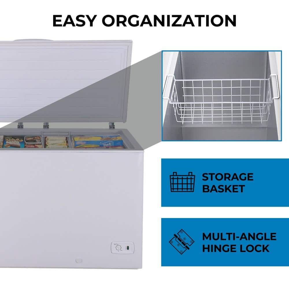 Garage-ready 14.6 cu ft deep freeze helps maximize your food storage in any space. Reliable compressor cooling and premium insulation maintain consistent operation. Stay-open lid and hanging storage basket provide easy access to all your contents.
