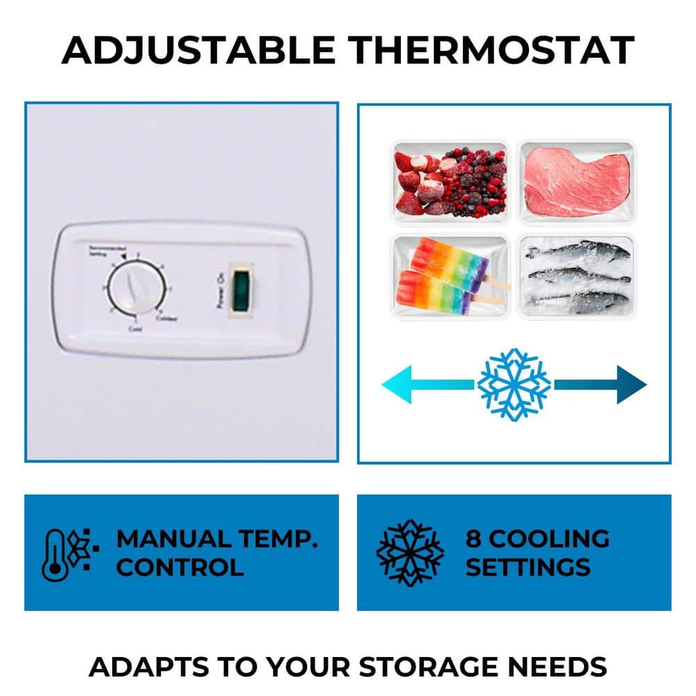 - Garage-ready deep freeze with adjustable thermostat