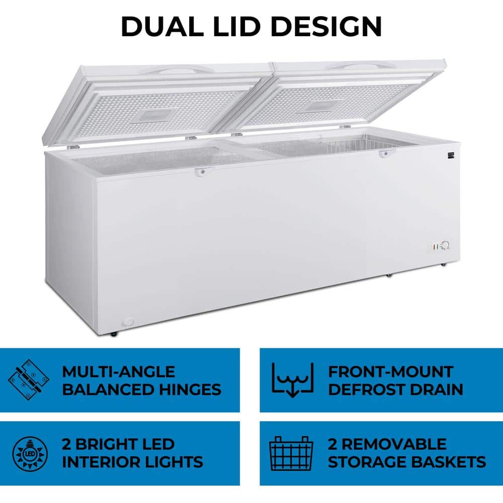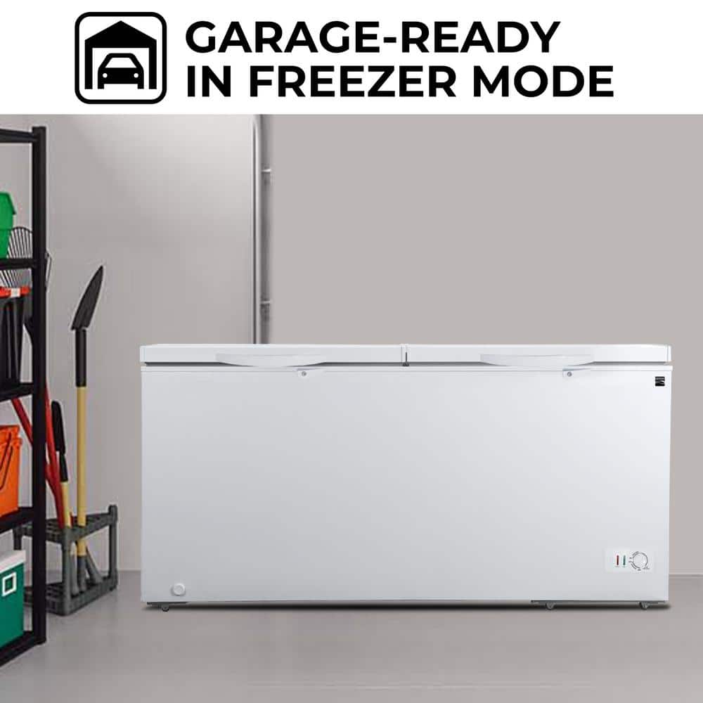Kenmore's convertible refrigerator/freezers put convenience and flexibility right at your fingertips. This ESTAR-certified dual lid deep freeze is garage-ready in freezer mode and features a huge 25 cu. ft. (710L) capacity and keyed safety locks for your peace of mind. Balanced hinges stay-open lids keep your hands free while removable storage baskets and bright LED interior lights make it easy to organize and access all of your contents.