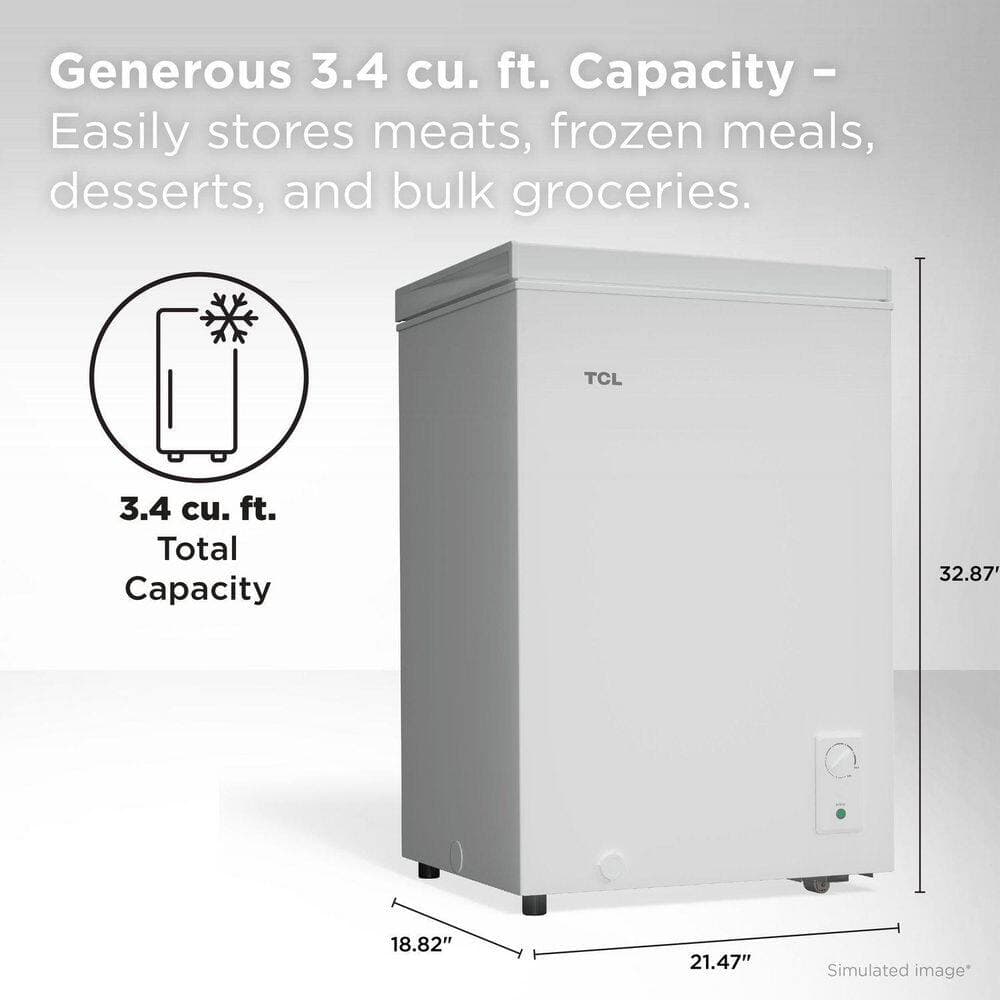 Keep your favorite meals and ingredients on hand with the TCL 3.4 Cu Ft Chest Freezer. Designed for convenience, this compact but spacious freezer chest provides plenty of room for everything from family-sized cuts of meat to frozen vegetables and ice cream, making it easy to stock up and save time on weekly grocery runs. Its energy-efficient, low-noise compressor ensures quiet operation and minimal impact on your energy bill, so you can place it in your kitchen, garage, dorm, or even an office without disruption. The adjustable temperature dial lets you fine-tune settings to keep food preserved just the way you like, while the included removable basket helps organize smaller items for quick access. A balanced-hinge lid stays open at multiple angles, allowing for safer loading and unloading. With its slim design and dimensions of 21.47" W x 18.82" D x 32.87" H, this chest freezer is perfectly sized for smaller living spaces without sacrificing performance, giving you reliable frozen storage where you need it most. Keep your pantry full and your schedule clear with TCL.