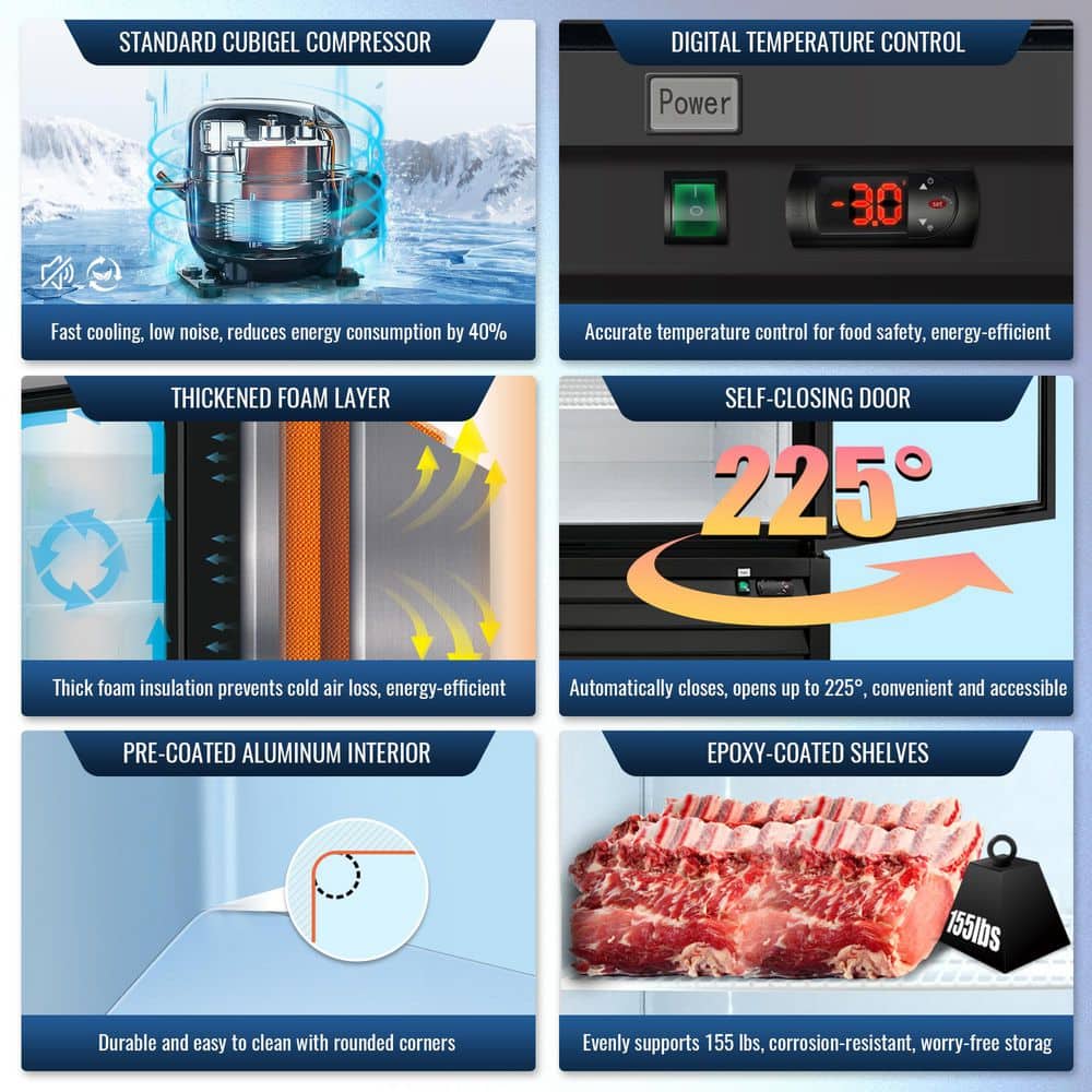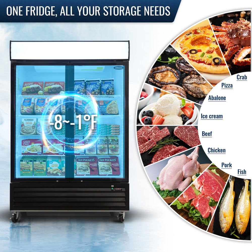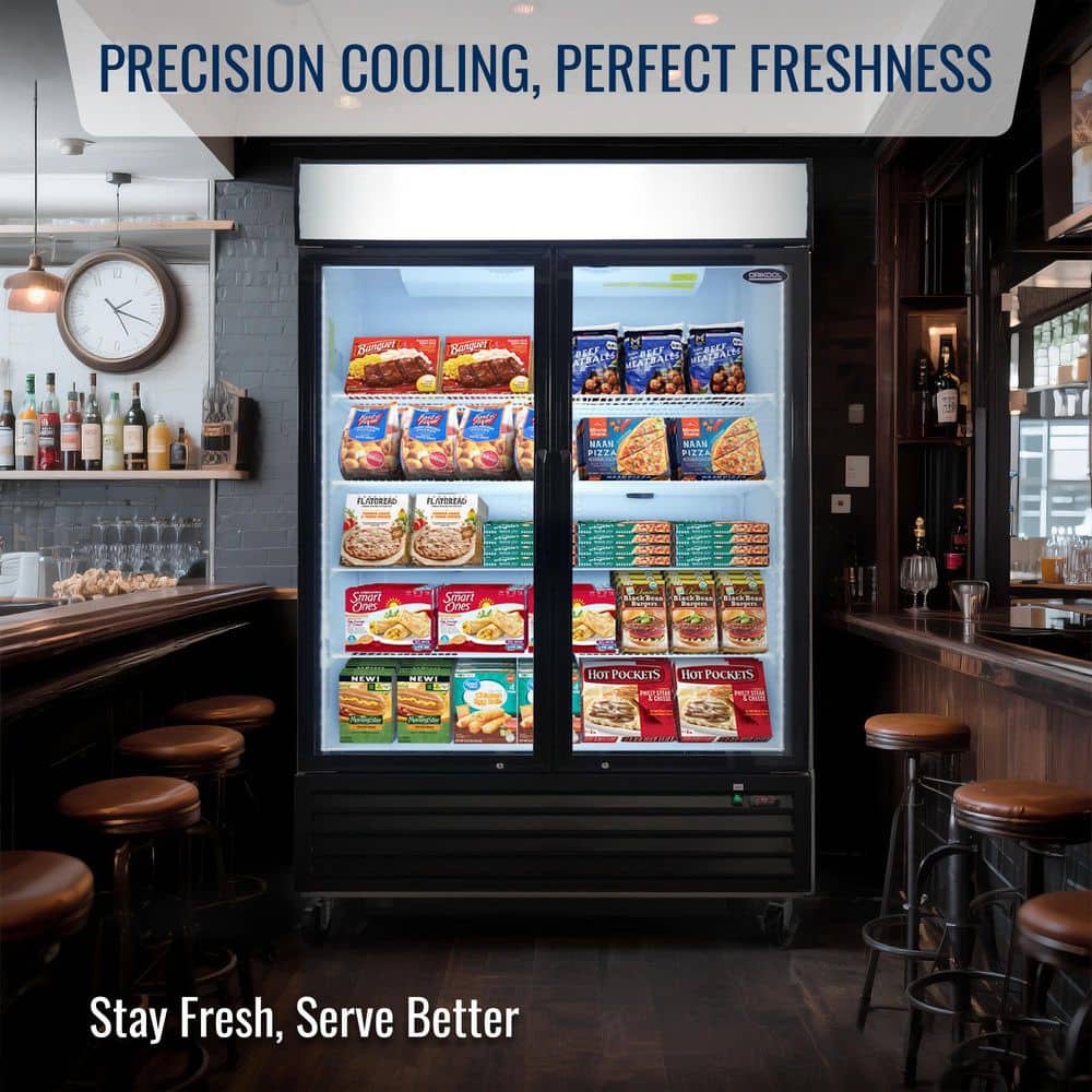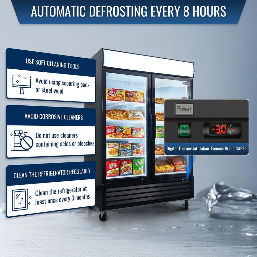 Keep your food perfectly frozen and your business running smoothly with our dual-door commercial freezer. Featuring low-e triple hollow tempered glass doors with magnetic gaskets, this durable unit locks in freshness while reducing energy consumption. The CAREL digital thermostat maintains a safe temperature range of -8°F to -1°F, with automatic defrosting every 8 hours to ensure hassle-free operation. With 8 adjustable epoxy-coated shelves supporting up to 155 lbs each, you get flexible, organized storage for all your products. A customizable illuminated top panel enhances brand visibility, while heated door frames prevent condensation. Energy-efficient LED lighting, secure locks, and smooth mobility with casters make this dual-door freezer a reliable, professional solution for any commercial kitchen or retail display.