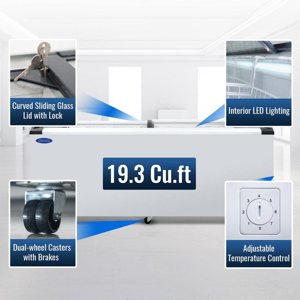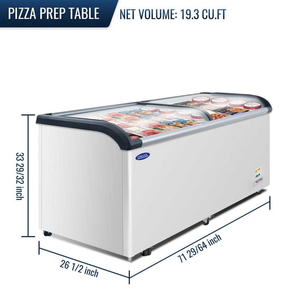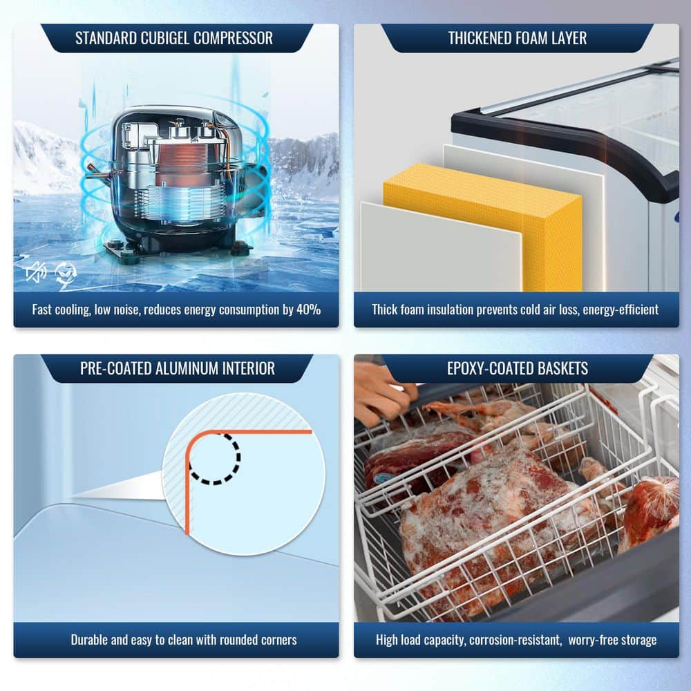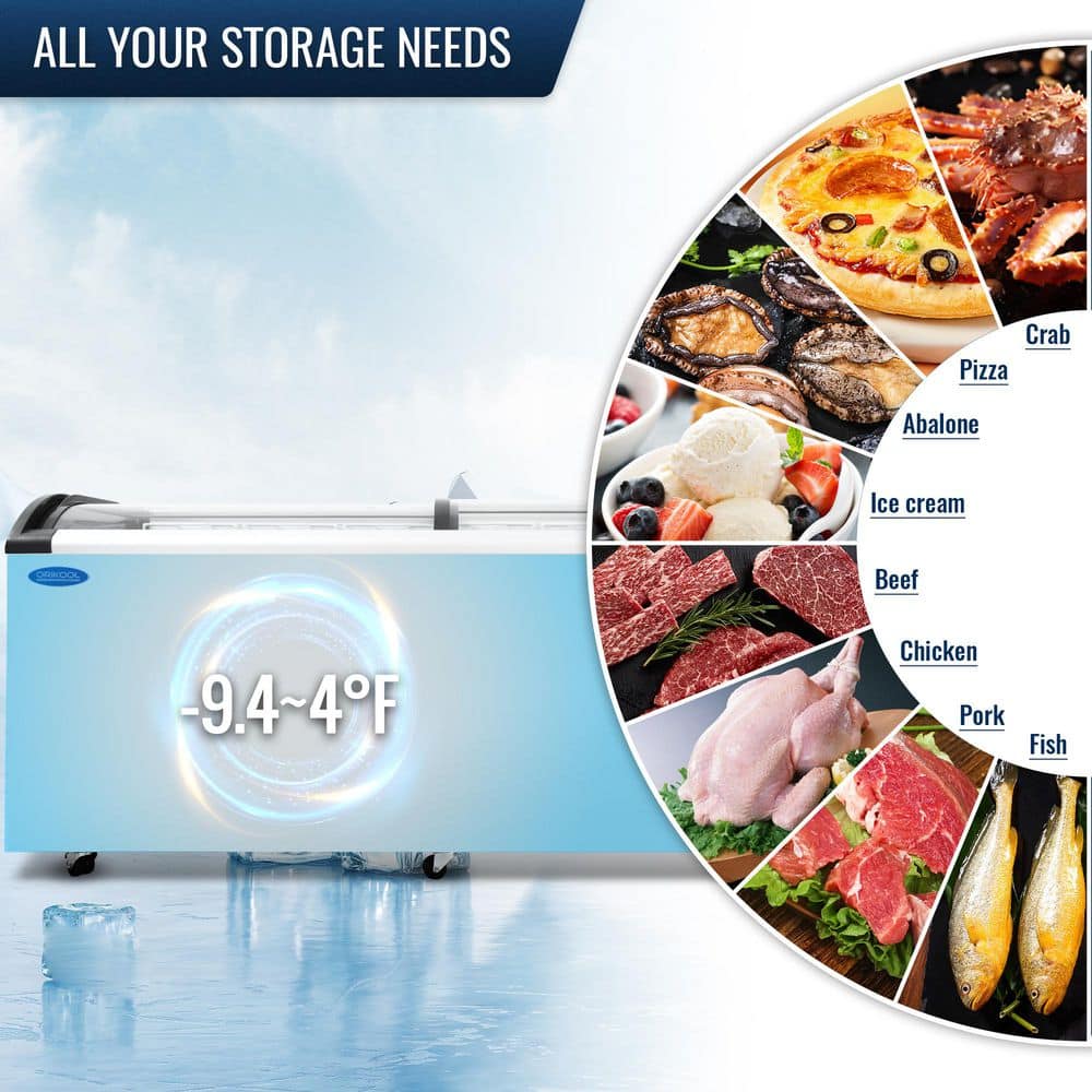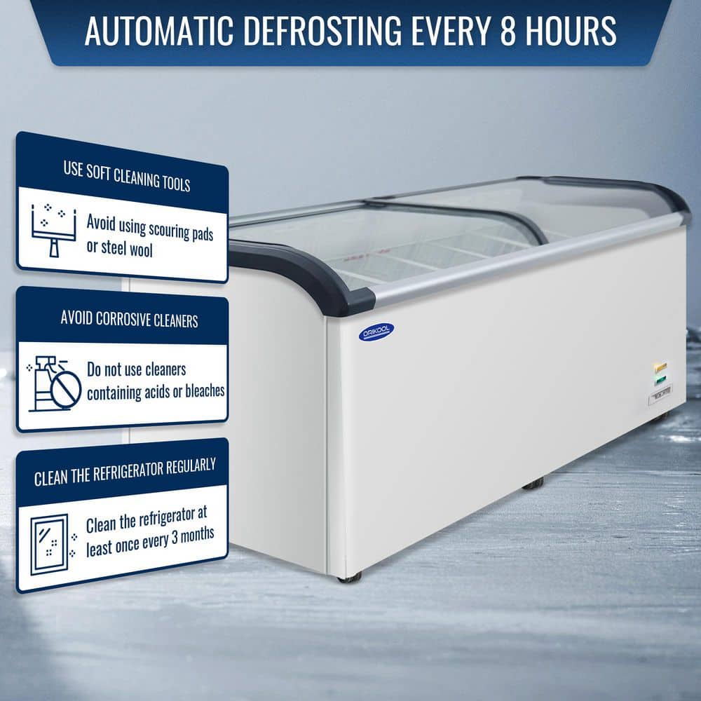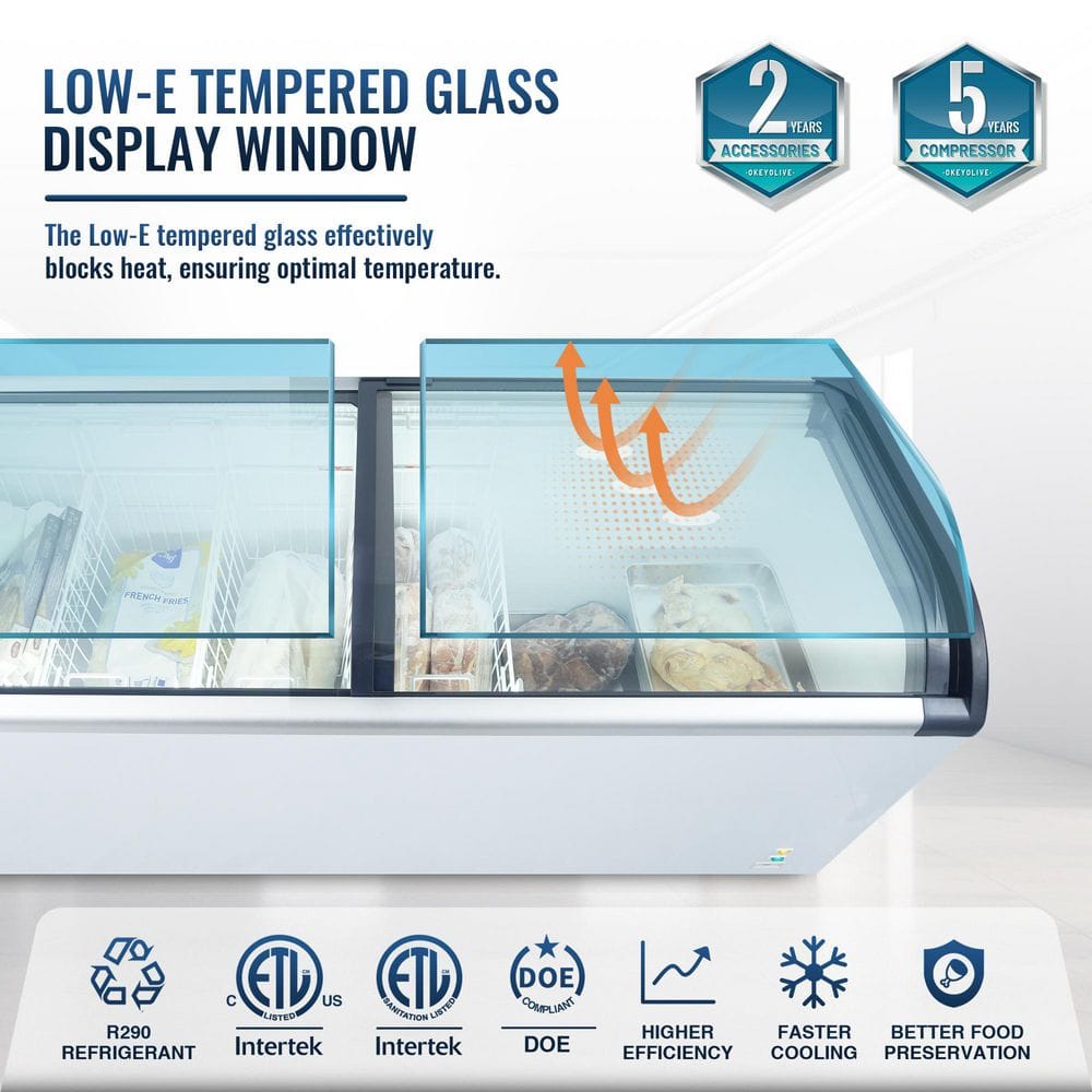 Designed to maximize product visibility and impulse sales, this 19.3 cu. ft. Curved Top Commercial Display Chest Freezer combines clear presentation with reliable commercial performance. The curved anti-fog sliding glass lid and bright LED interior lighting showcase ice cream and frozen treats while allowing easy self-serve access. Built with a durable stainless steel exterior, commercial-grade compressor, and eco-friendly R290 refrigerant, this freezer delivers consistent low-temperature storage and long-term efficiency for high-traffic retail environments.