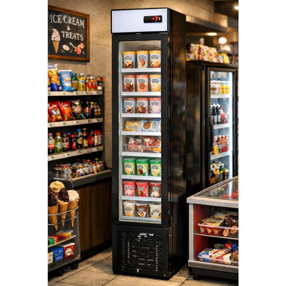 Introducing the NSF-Certified Narrow Glass Door Freezer-a compact yet high-performing cold storage solution designed to fit where space is at a premium. This slim, upright unit delivers efficient freezing temperatures and clear product visibility, making it an excellent choice for small restaurants, cafes, convenience stores, and grab-and-go setups.Despite its narrow footprint, this freezer offers a surprisingly roomy interior equipped with adjustable wire shelving, allowing you to optimize layout for packaged meals, ice cream, desserts, or specialty items.Energy-saving LED lighting illuminate's products from top to bottom, enhancing both visibility for staff and enticing display for customers. The self-closing door minimizes temperature fluctuations, and in many models, features a stay-open mechanism at a certain angle-making restocking faster and more convenient.Built to NSF standards, the freezer boasts a durable, food-safe construction that meets health code requirements, with smooth surfaces and rounded corners for easy cleaning. A digital temperature controller offers precise adjustments, while heavy-duty casters (where available) simplify repositioning for floor maintenance or layout changes.Together, these features ensure reliable performance in demanding commercial environments. If you're seeking a space-efficient, visually appealing freezer with robust, professional-grade quality, the NSF Narrow Glass Door Freezer stands out as a dependable choice.