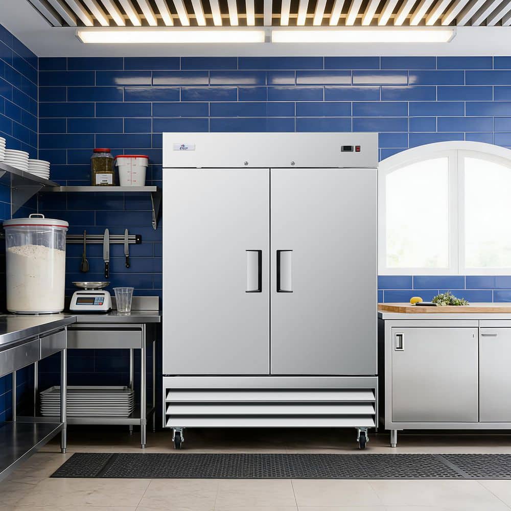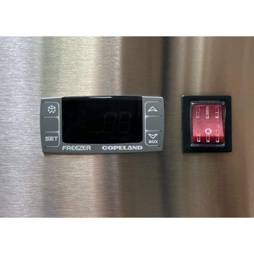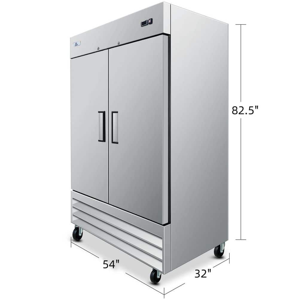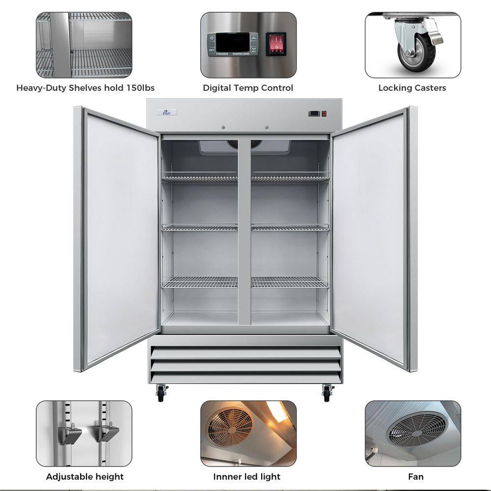 This 54 in. wide, 48 cu. ft. NSF-certified commercial reach-in freezer is built with premium 430 and 304-stainless steel for exceptional durability and long-lasting performance. Ideal for restaurants, cafes, bakeries, bars, grocery stores, and even home garages, it reliably keeps ingredients like meat and fish frozen and fresh. The bottom-mounted compressor uses eco-friendly R290 refrigerant and operates efficiently on a standard 115V outlet. With a power rating of 751-watts, it's both energy-efficient and cost-effective. The digital temperature display and knob allow easy adjustments between -8° F and 0° F (-22° C to -18° C), while integrated LED lighting simplifies inventory management. Self-closing solid stainless steel doors help maintain consistent internal temperatures, and automatic defrosting eliminates the need for manual maintenance.Certified by both NSF and ETL, this freezer meets rigorous standards for safety, sanitation, and energy efficiency.