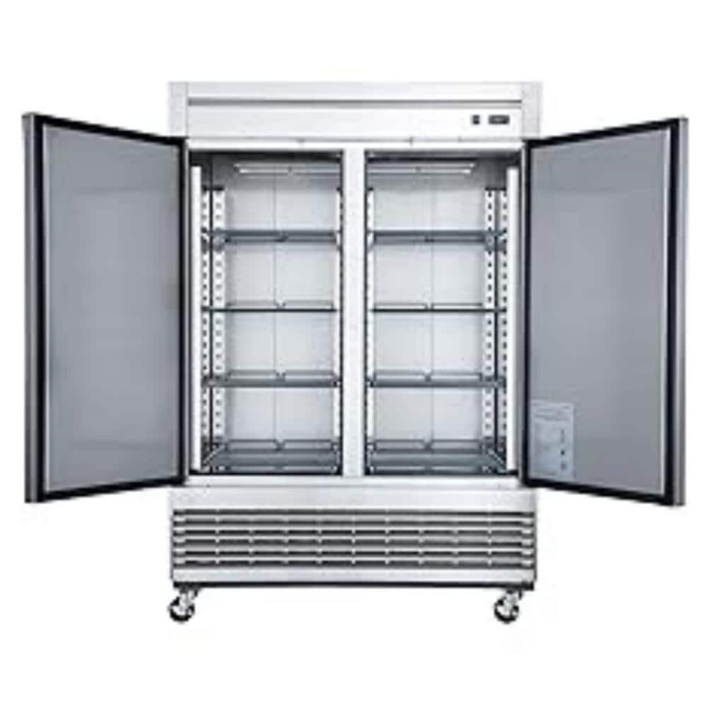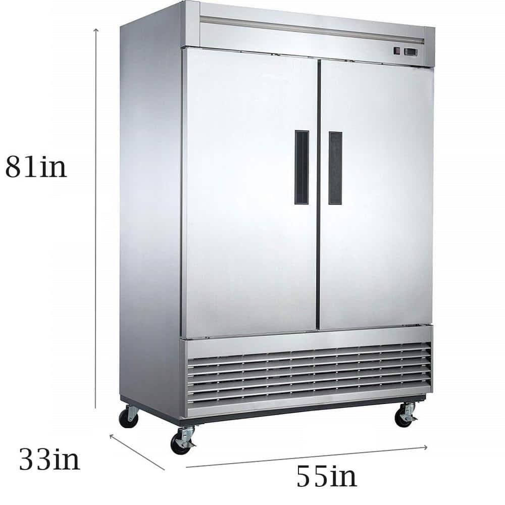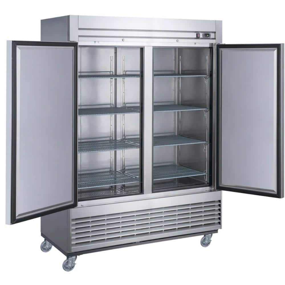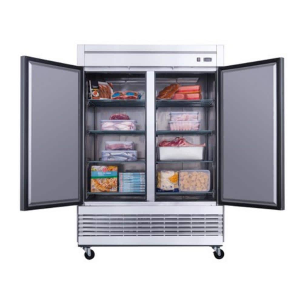 The Cooler Depot DXXD55F reach-in commercial freezer is designed to suit the needs of any business who needs optimal performance without sacrificing design. Its' two doors are accented with high-quality brushed stainless steel for both the interior and exterior to fit a variety of decors. Recessed door handles allow for clean styling and better ergonomics. The heavy-duty 1-1/3 compressor is bottom mounted for excellent efficiency and better cooling. Digital controls fine-tune the desired interior temperature. Self-closing doors free up your hands for added convenience and ease of use. Auto-defrosting provides lower energy costs and colder temperatures. The included 8 shelves can be adjusted or removed for flexibility and maintenance. Easily move and position with four swivel casters.