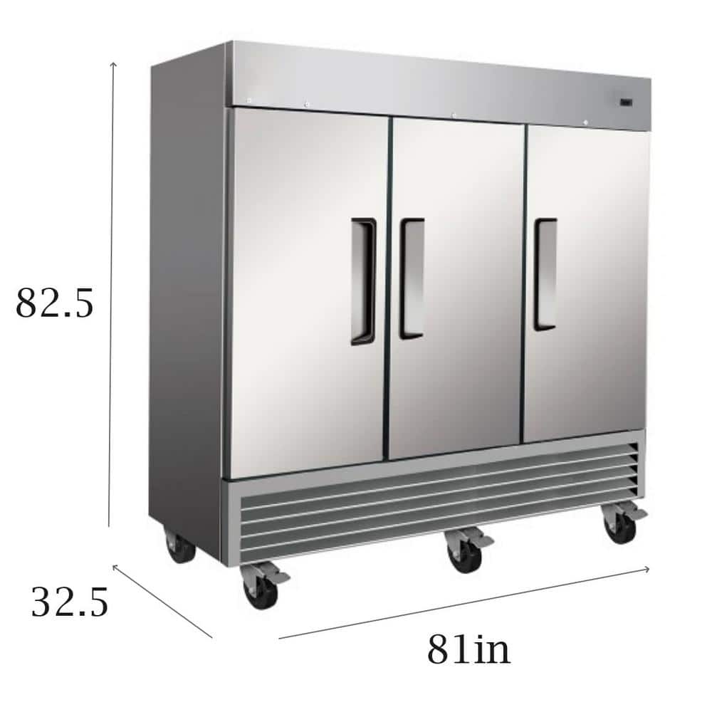 Cooler Depot represent you, 3-doors commercial reach in upright freezer. 81 in. W 72 cu. ft. capacity handles pretty much all medium restaurant applications. Refrigeration system holds -8°F to 0°F for the best in food preservation. Digital control system not only makes it easy to adjust temperature, but will also show you error code to indicate where the problem is when anything happens to the unit.