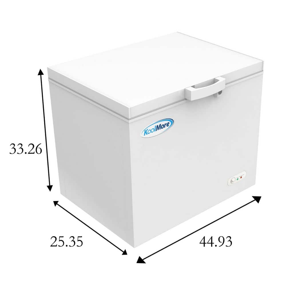 Often times you need more storage space, especially if you need to store lots of meat or every day goods for your family, guests, or customers. That's why the Koolmore Chest Freezer with 9.6 cu. ft. of storage provides the ideal storage area you need for storing beef, steaks, ice cream, pre-made meals, and so much more.All with eco-friendly refrigerant that helps maintain optimal temperatures better and more efficiently than standard freezers. A deep, wide-open design that offers 9.6 cu. ft. of space, this indoor freezer with 1 epoxy-coated steel basket and two standing ledges lets you organize your food more effectively.Our compact freezer boasts a full one-piece lid design that makes it easier to open up to view the entire contents and identify and access your food more quickly.Featuring a beautiful, white-painted steel exterior with a silver aluminum interior our chest freezer pairs well with almost any setting. It easily blends into your room or storage area while providing much-needed organization where you need it most.