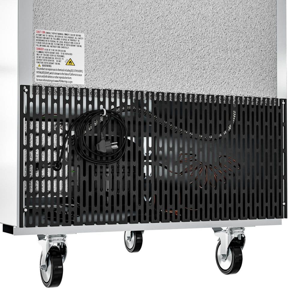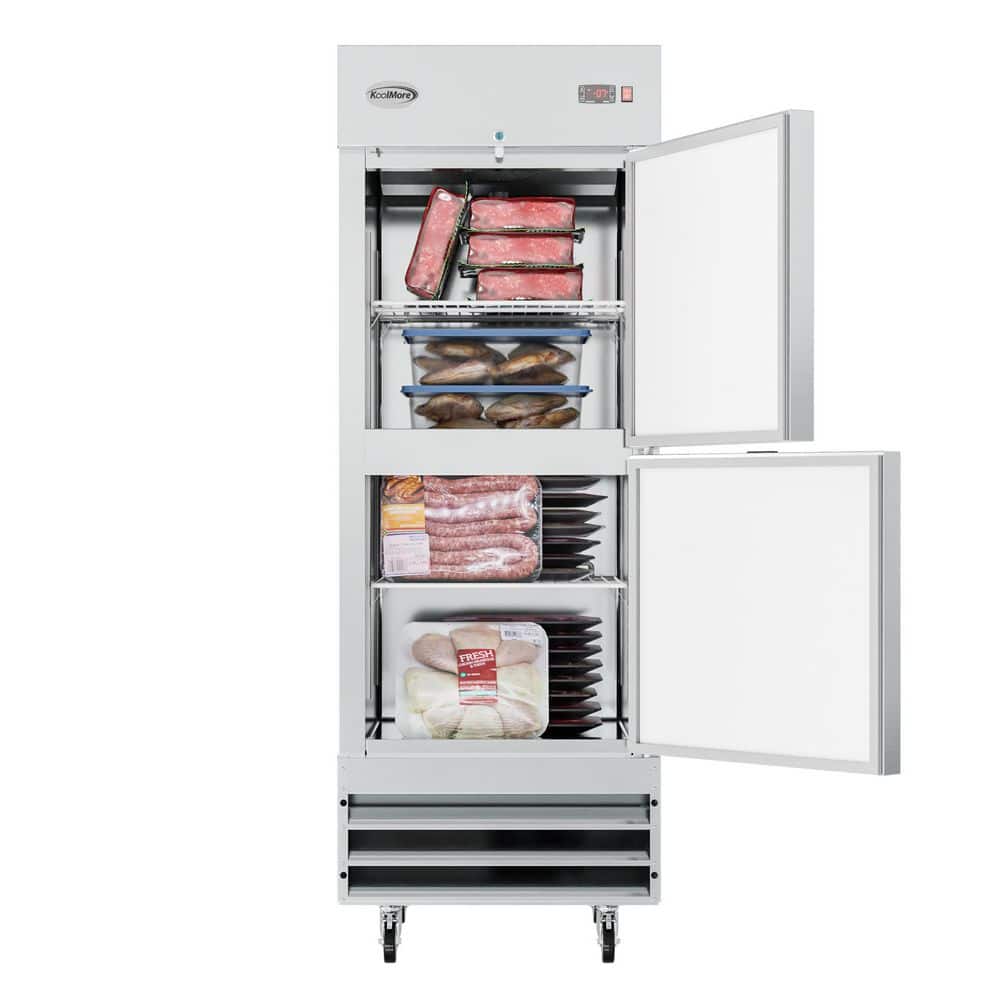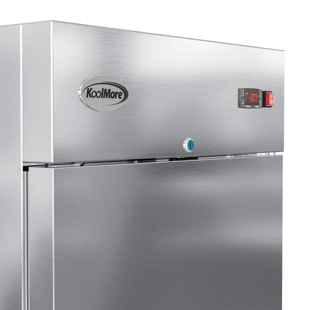 Your commercial kitchen deserves a cool, sleek, convenient freezer solution. The Koolmore Single door Reach-In Commercial Freezer is made of gleaming stainless steel. A 2-door NSF Commercial Freezer to store your inventory and keep your product fresh and healthy. Ideal for restaurants, cafes, hotels, and commercial kitchens. A bottom-mounted compressor and raised bottom shelf make for convenient loading, unloading, and maintenance. Recessed handles for easy access. The self-closing feature ensures food remains frozen and fresh. 3 deep adjustable shelves coated in epoxy for maximum corrosion resistance. This tall freezer holds up to 23 cu. ft. of space. External digital controls and display to easily monitor and control temperature. 4 casters make it highly portable for kitchen convenience. Highly certified: ETL Listed for Safety and Sanitation, making it NSF ANSI 7 Standard for Commercial refrigerators. It's time to make your kitchen more. It's time for Koolmore.