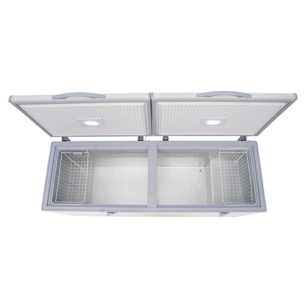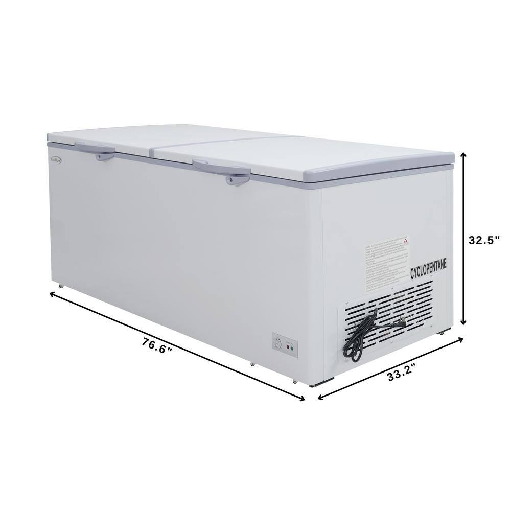 Often times you need more storage space, especially if you need to store lots of meat or every day goods for your family, guests, or customers. That's why the Koolmore Chest Freezer with 24 cu. ft. of storage provides the ideal storage area you need for storing beef, steaks, ice cream, pre-made meals, and so much more.All with eco-friendly refrigerant that helps maintain optimal temperatures better and more efficiently than standard freezers. A deep, wide-open design that offers 24 cu. ft. of space, this indoor freezer with two epoxy-coated steel basket and two standing ledges lets you organize your food more effectively.Our compact freezer boasts a double lid design that makes it easier to open up to view the entire contents and identify and access your food more quickly.Featuring a beautiful, white painted steel exterior with a silver aluminum interior our chest freezer pairs well with almost any setting. It easily blends into your room or storage area while providing much-needed organization where you need it most.