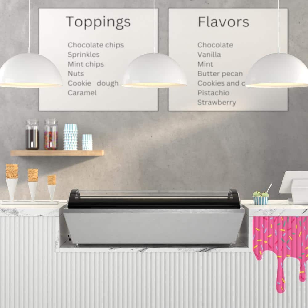 KoolMore 45 in. Countertop Ice Cream Display Freezer with Curved Glass Top with 6 PansThe 45 in. Countertop Ice Cream Freezer is a stylish and functional solution for ice cream shops, cafes, and food service venues. With a static cooling system that preserves frozen goods at an ideal temperature range of 7.6°F to 10.4°F, this freezer ensures the best quality for your ice cream and desserts. Its stainless-steel body and double-tempered glass construction promise durability and safety, while the curved glass display cover provides clear visibility of products while protecting them from contaminants. The soft-closing cover adds convenience and extends the unit's lifespan. The freezer comes with 6 ½ GN pans, allowing you to showcase multiple flavors at once. Its compact countertop design optimizes space, and the energy-efficient operation of 1080 KWH/year reduces costs. The digital temperature control makes it easy to adjust settings, while the plug-and-play installation ensures quick setup. ETL certification guarantees safety and sanitation compliance, making this unit a reliable choice for any establishment.