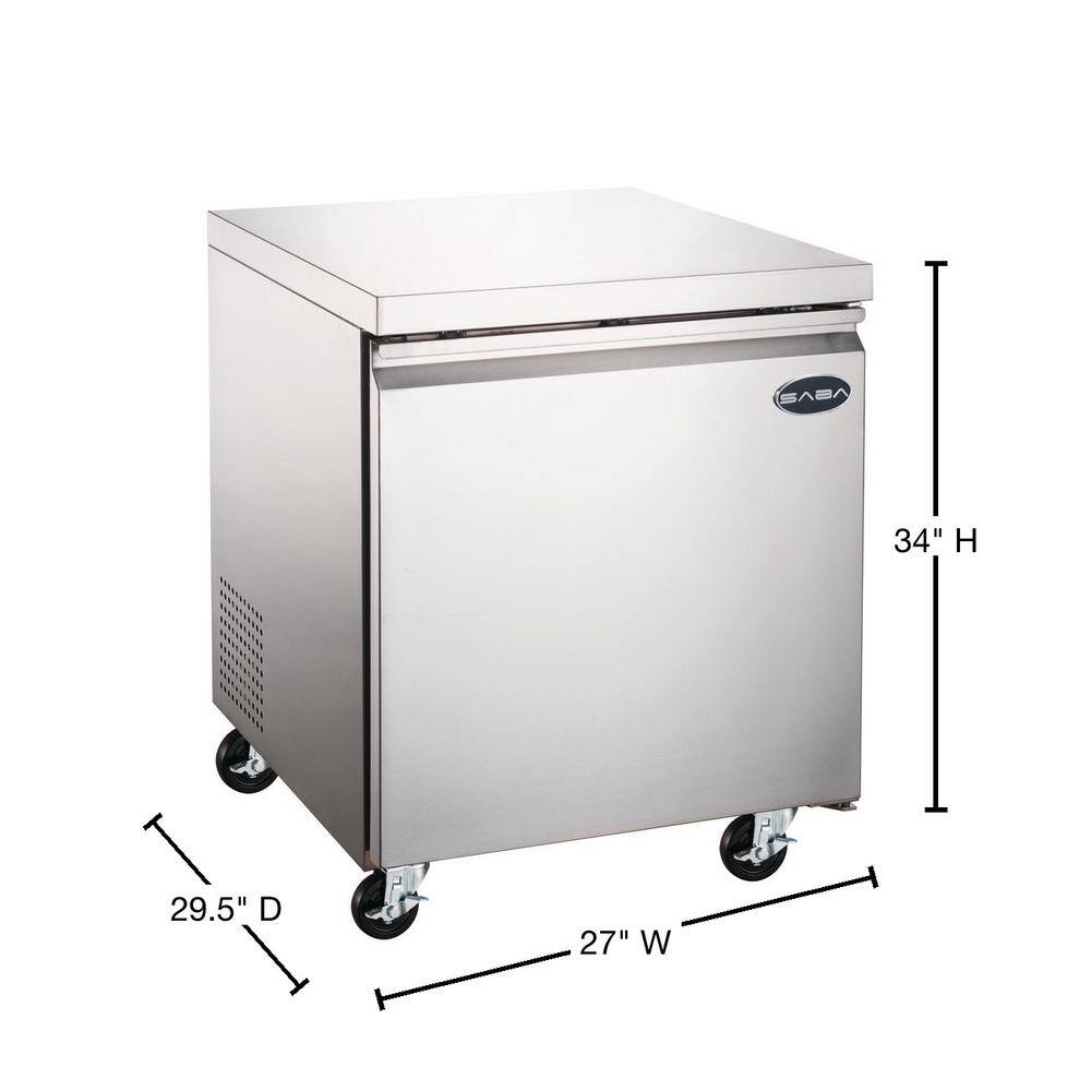 SABA under counter freezers give you a great amount of food storage for your goods below and can also be used as a work top. This multi-purpose unit helps to free up space in your kitchen or helping you fit both a freezer and a meal prep station in tight quarters. This design has a stainless steel interior and exterior and easily fits under any countertop allowing for food storage or beverage storage. These freezers come with heavy duty casters allowing easy movement for cleaning or maintenance. SABA under counter freezers are economical, yet designed to provide years of trouble-free service for any demanding application. These SABA units come in 27 in. and 48 in.