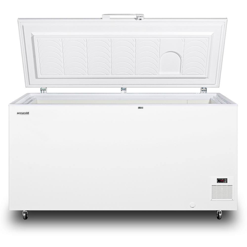 Manufactured for Summit in Denmark by ELCOLD, Accucold EL51LTW is a -45°C capable chest freezer built with solid insulation for commercial, institutional, laboratory, and life science storage applications. This 15.5 cu. ft. chest freezer uses static manual defrost cooling to maintain a more stable temperature, with an externally controlled digital thermostat to ensure easy temperature monitoring. Extra thick 4-1/2 in. thick insulation offers added efficiency and reliability. Additional features include a solid, easy-grip handle complete with factory installed lock, a sturdy set of casters, and counterbalanced hinges for comfortable loading and unloading. This unit includes a factory-installed probe hole to allow users to install their own monitoring equipment. The EL51LTW is UL-S Listed to ANSI-NSF commercial standards and is designed to operate between -10°C and -45°C. It utilizes R290a refrigerant to comply with new CARB regulations. Additional sizes are available.
