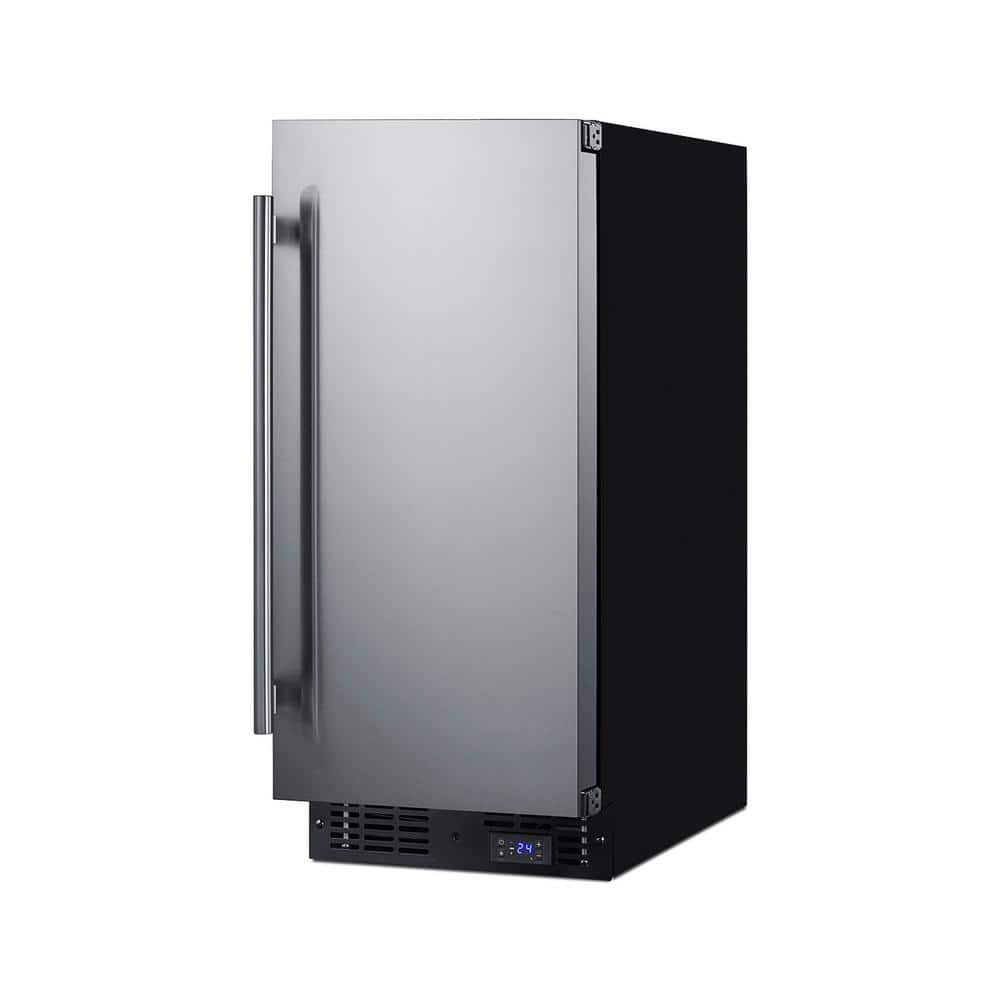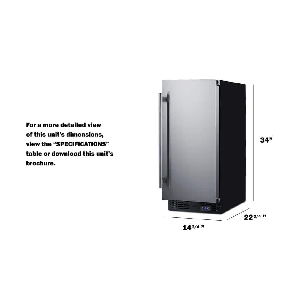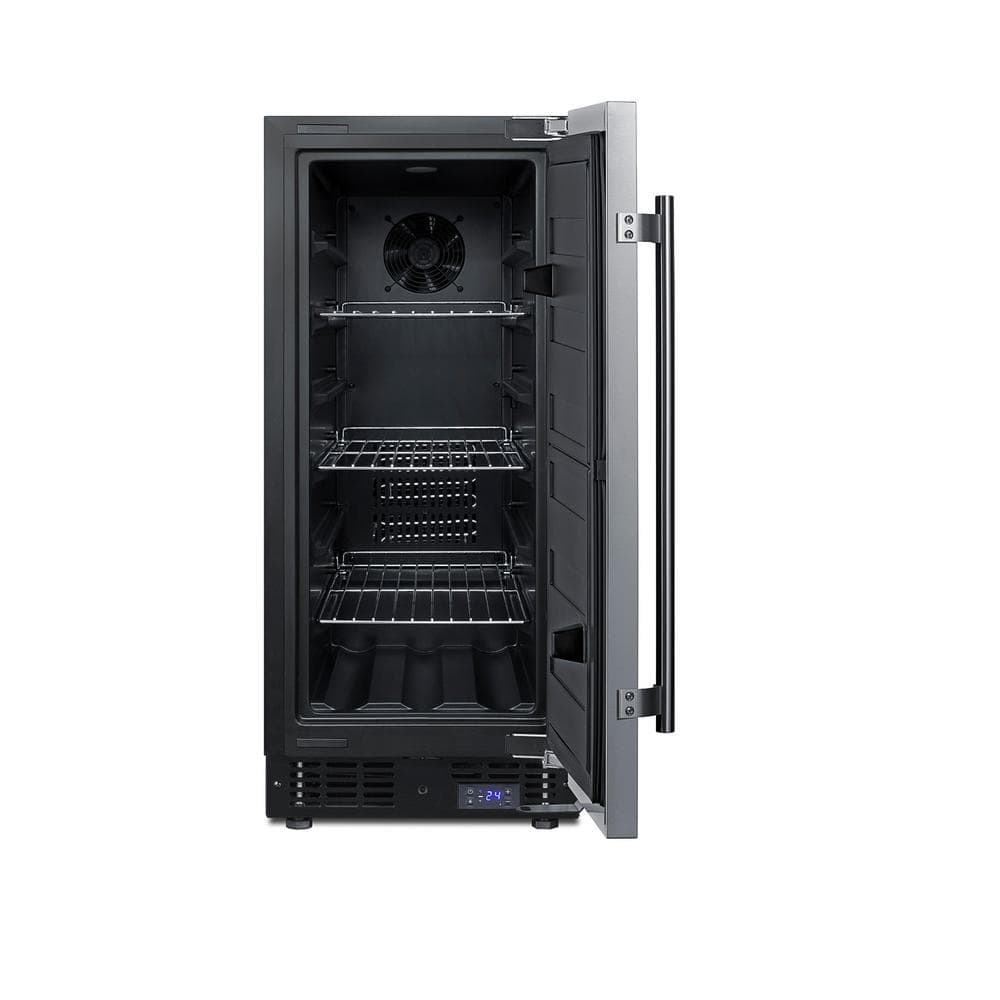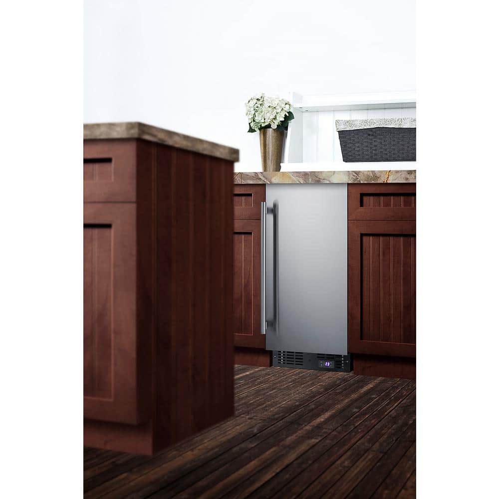 SUMMIT brings true convenience to small kitchen spaces with the SCFF1533BSS, a 15 in. wide fully frost-free all-freezer. The SCFF1533BSS is front-breathing for built-in use under counters, but also features a fully finished black cabinet to allow freestanding use. The user reversible door is fully wrapped in stainless steel, with a European-style fully articulating hinge to ensure a clean fit. This unit includes a pro style handle and factory installed lock located in the kickplate. Inside, the SCFF1533BSS is fully frost-free to minimize user maintenance, with slide-out chrome shelves that can be adjusted to accommodate a variety of items. Recessed LED lighting provides an elegant and efficient display inside the 2.4 cu. ft. interior. This unit includes a digital thermostat in the kick plate for easy and intuitive temperature control. With a uniquely slim size and user-friendly features, the SCFF1533BSS is the ideal freezer for space-challenged homes. This unit can be paired with the matching FF1532BSS/E all-refrigerator as a side-by-side set or combined with our Stack15. It is ETL-S listed to NSF-7 commercial standards and meets UL-471.