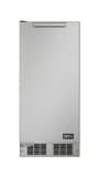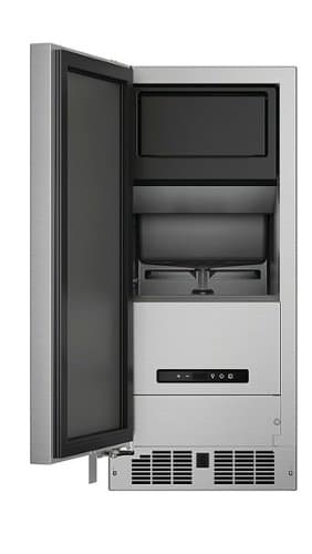 Enjoy a steady supply of fresh ice, perfect for creating your favorite cold beverages while entertaining. 15-inch outdoor ice maker with a left hinge that is used for producing up to 39 lbs. of clear, fresh ice per day. It has features such as LED lighting, a sound-buffering deflector, eco-ice mode, and a door alarm.