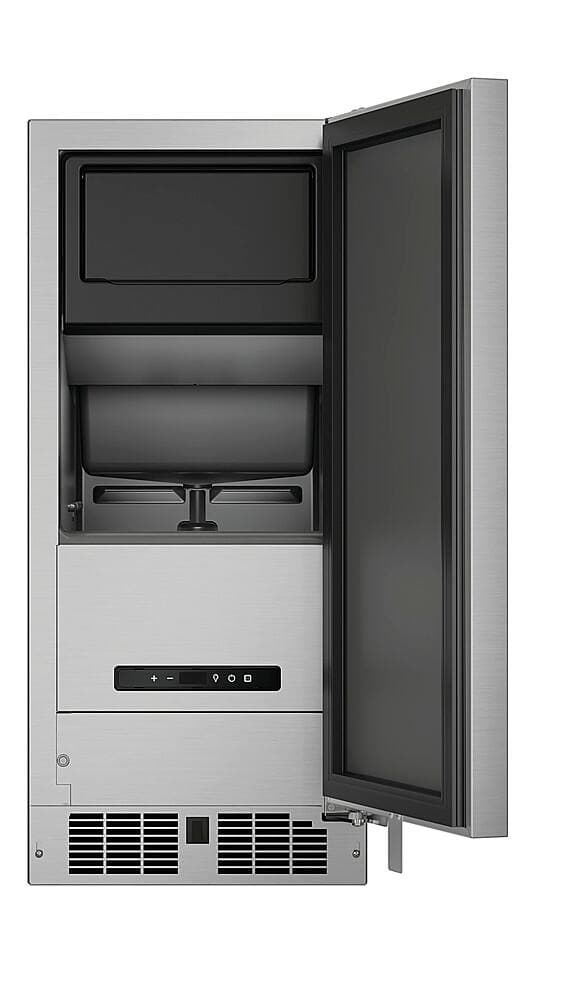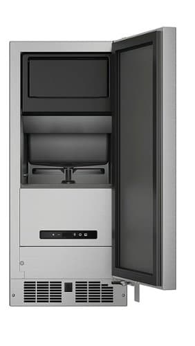 Enjoy a steady supply of fresh ice, perfect for creating your favorite cold beverages while entertaining. 15-inch outdoor ice maker with a right hinge that is used for producing up to 39 lbs. of clear, fresh ice per day. It has features such as LED lighting, a sound-buffering deflector, eco-ice mode, and a door alarm.