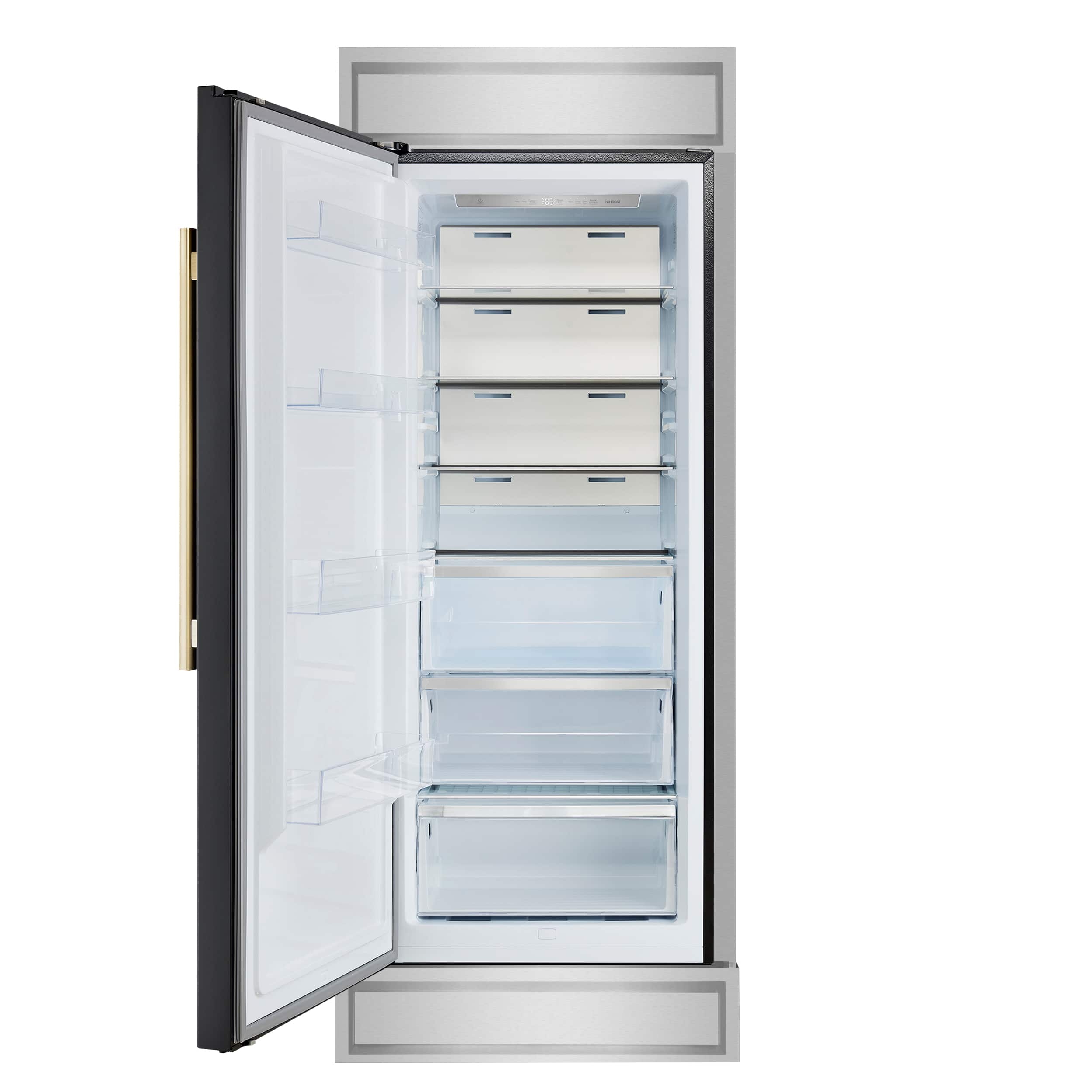 The Forno Maderno 13.6 Cu. Ft. Built-In Convertible Refrigerator-Freezer offers a built-in look with a smooth decorative grill to upgrade it to 32-inch width for seamless kitchen integration. Available in black and featuring antique brass handles, it’s part of our elegant Espresso line. With 13.6 cu.ft. of capacity and a Convertible Cooling Zone, it delivers flexible storage and functionality. Total No-Frost Technology eliminates manual defrosting, while the Metal Multi-Airflow system maintains consistent freshness. Inside, 3 glass shelves and 3 drawers with silver trims maximize organization. The swing door design and intuitive electronic touch control panel enhance everyday convenience. VCM doors, a metal back panel, and Energy Star Certification ensure durability and efficiency.