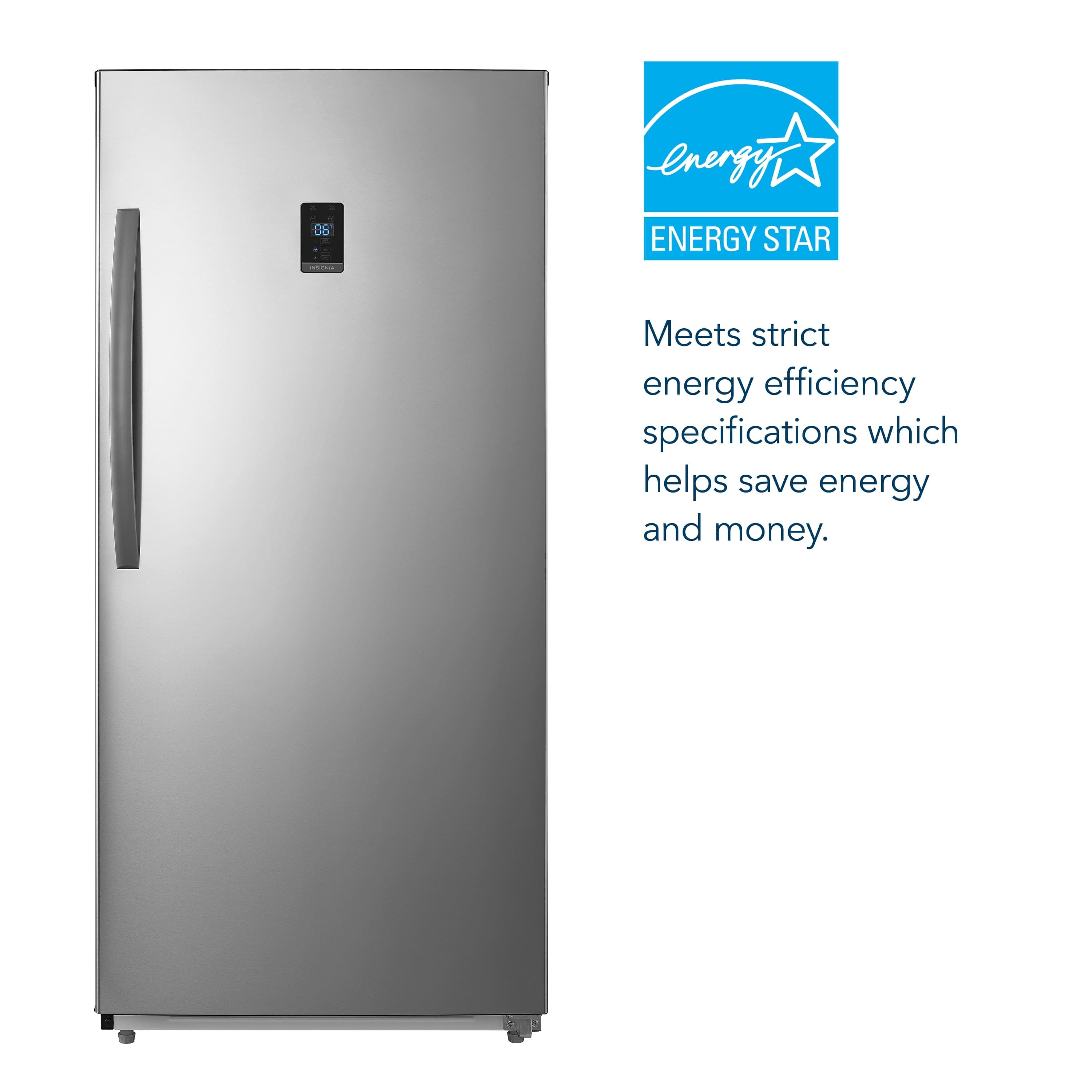 Expand your cold storage space with this 13.8- cu. ft. Insignia upright stainless steel convertible freezer/refrigerator. The four glass shelves give you options for organizing food, and the automatic defrost keeps icy buildup at bay. This convertible freezer/refrigerator has an alarm that lets you know when the door has been left open.