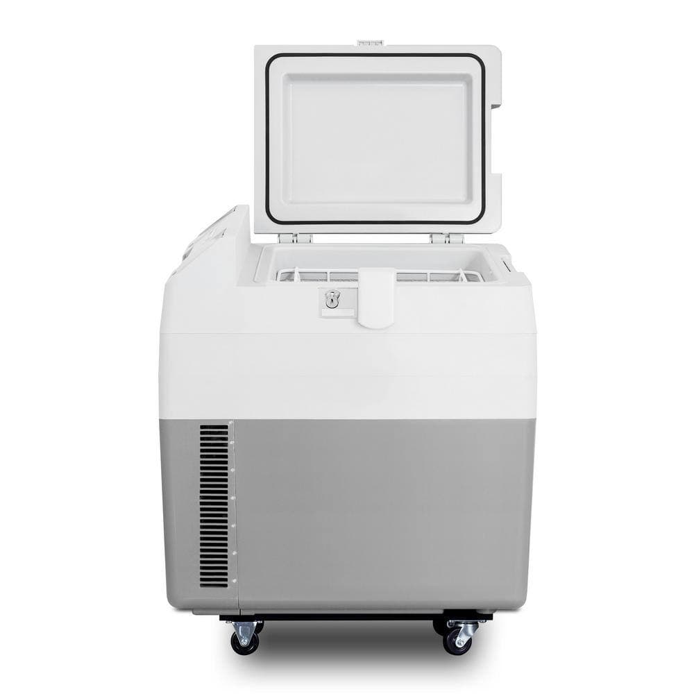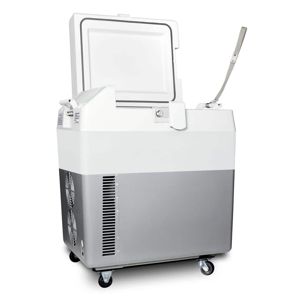 Accucold brings advanced convenience to cold chain management with the SPRF36M2, a fully featured portable cooler that can be set at refrigerator or freezer temperatures for the storage of select specimens, vaccines, and other materials. This lightweight compressor-operated unit can be plugged into the 12-Volt DC lighter socket inside any car, truck, RV, or boat, as well as 24-Volt sources. We also include an AC adapter to allow the SPRF36M2 to be plugged into a 120-Volt electrical wall outlet. It has a gray, plastic exterior for added durability. Four pre-installed wheels make moving the unit simple and easy, while the strap handle provides additional portability options for user convenience. Handles are also located on each side for easier lifting as needed. A factory-installed lock provides added security, with two keys included. The SPRF36M2 can be used as a refrigerator or freezer. The refrigerator has a temperature range of 2°C to 8°C perfect for storing samples, vaccines, and additional medical supplies, while the freezer can reach -15°C, allowing for the storage of select vaccination materials, ice packs and more. A digital thermostat with an external LED thermometer display allows easy temperature control without requiring users to open the lid. The hammered aluminum interior can hold up to 30 l. With a conveniently versatile design and reliable storage conditions, the SPRF36M2 is ideal for applications that require easy transportation of cold items.