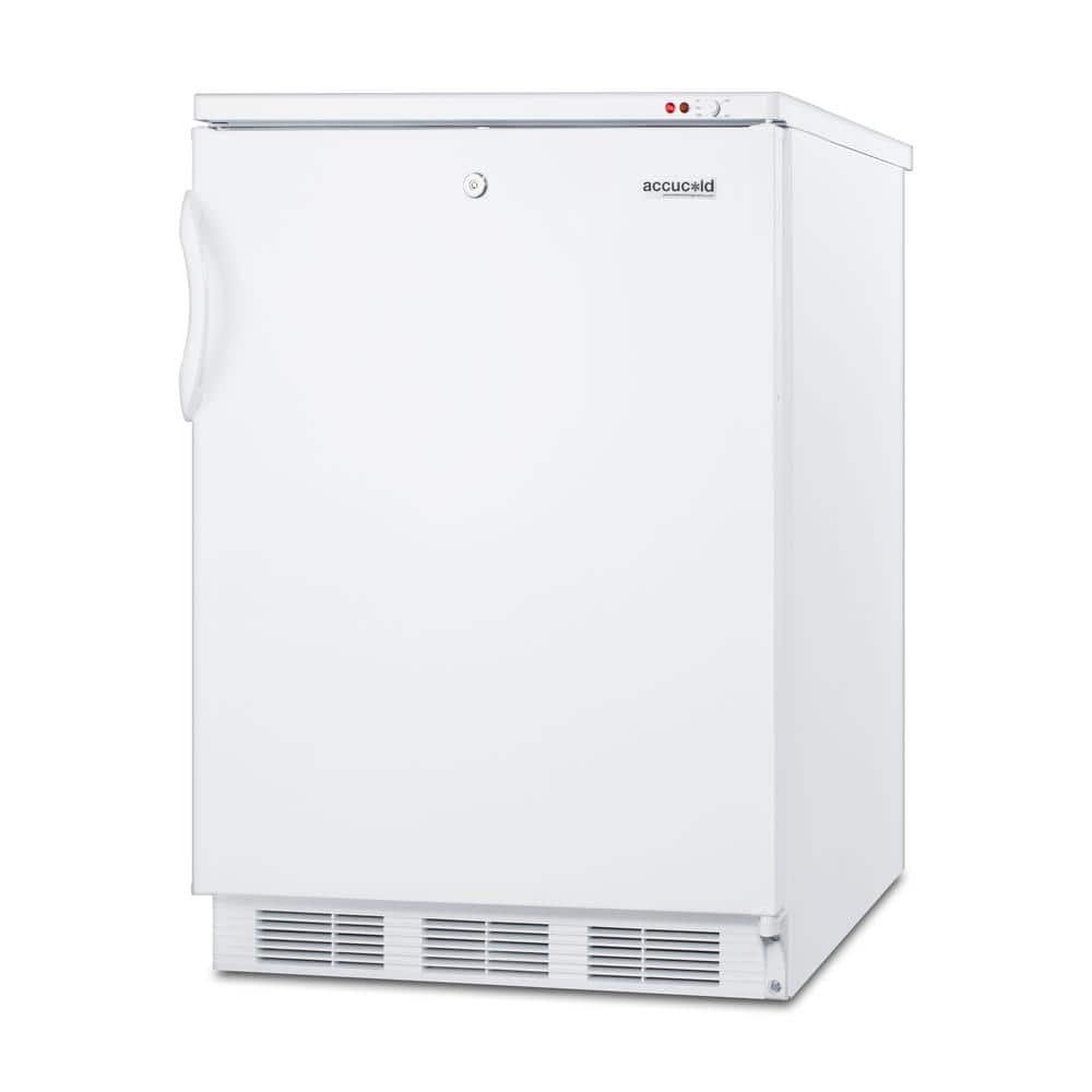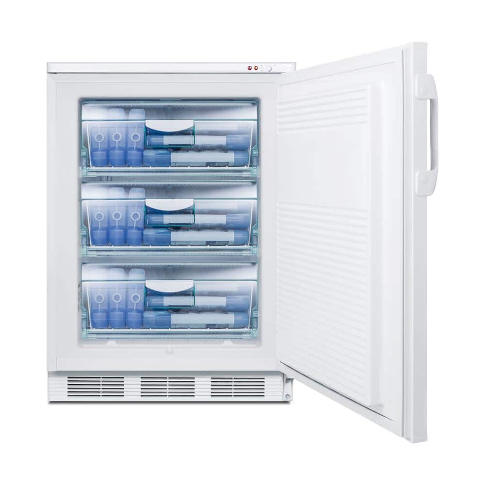 Accucold by Summit Appliance specializes in manufacturing refrigerators and freezers designed for medical, laboratory, and healthcare cold storage applications. The VT65ML is a counter height all-freezer constructed to operate at colder temperatures than standard household units, with a temperature range of -12°C to -25°C as recommended for vaccines, reagents, and other materials. Sized at just under 24 in. wide, it offers a generous 3.5 cu. ft. interior capacity. Three slide-out plastic drawers allow easy storage while protecting items from warmer ambient temperature when the door is opened. This is a manual defrost freezer with a dial temperature control conveniently located in the upper right exterior corner. It comes in a white finish with a user-reversible door and factory-installed lock conveniently located towards the top of the door for easier access. For an ADA compliant version of this unit, see the VT65MLADA.