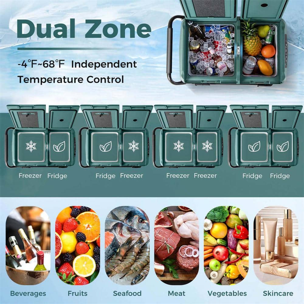 Stay cool during the off-road exploration with this portable 12V car refrigerator.Featuring dual-zone design with independent temperature control from -4℉ to 68℉, our fridge ensures perfect storage conditions for a variety of items, such as beverages, fruits, seafood, meat, vegetables, skincare, etc. Equipped with a powerful compressor, this car freezer can quickly cool down to 32℉ in just 10 minutes. Users can enjoy versatile power supply options with included 12/24V DC and 100-240V AC power cords, suitable for home and outdoor use in vehicles, boats, trucks, and more.