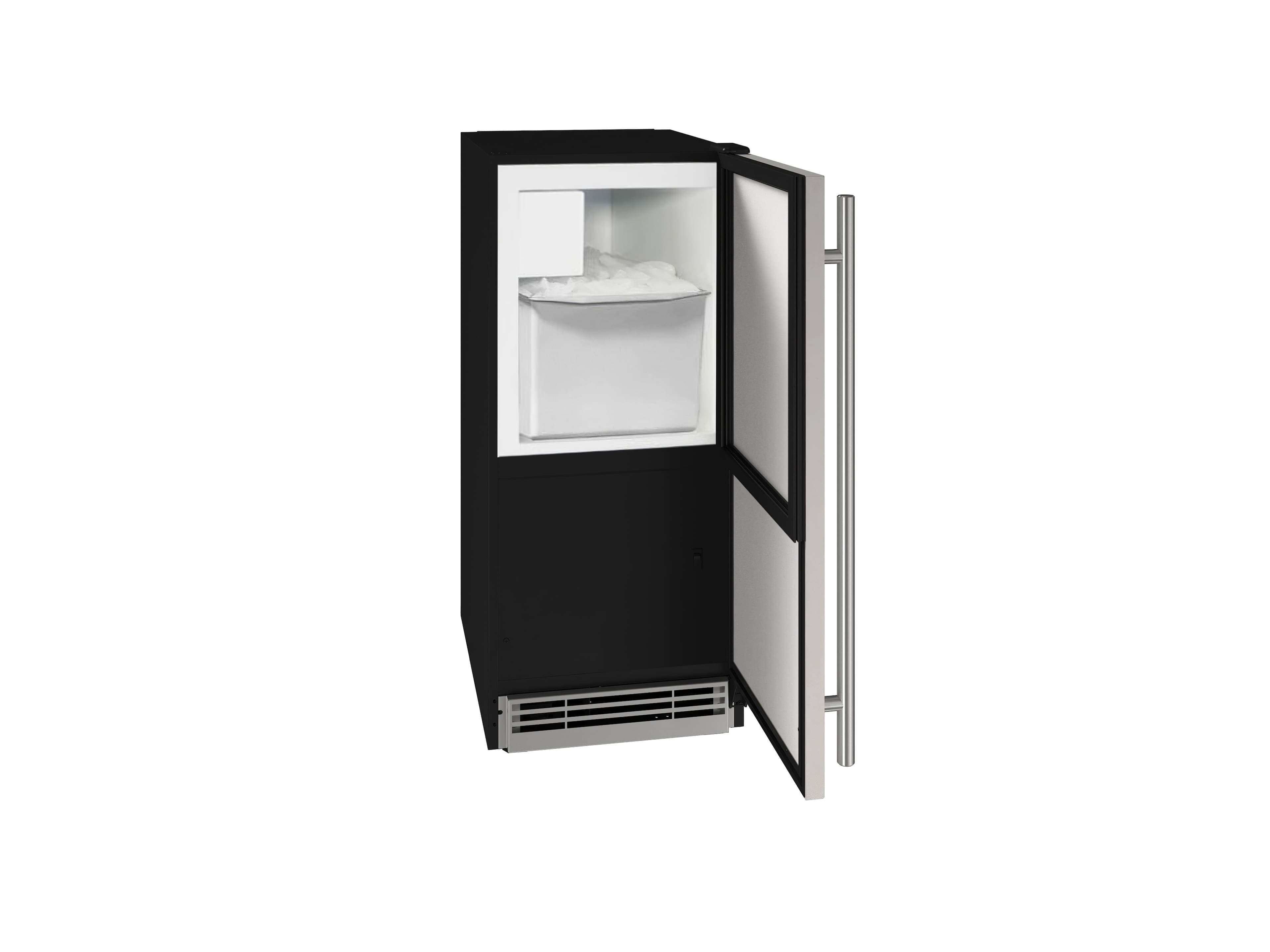 The U-Line UHCR115-SS01B is a 15-Inch Crescent Ice Maker that provides unsurpassed performance. Daily ice production is approximately 4 times greater than the average household refrigerator. It produces up to 25 lbs. of ice per day and a storage capacity of 25 lb. of ice. It has a stainless steel full wrap door and handle. It is field reversible and can be a built-in or freestanding unit. This U-Line's Crescent Ice Maker is in stainless steel solid and there is no drain required.