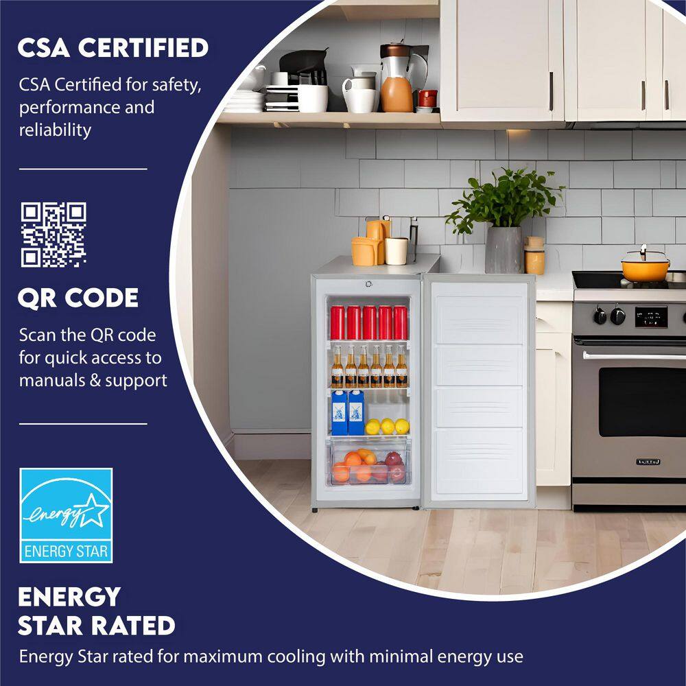"The Conserv FR 430 SC Convertible Upright Freezer-Refrigerator is more than just an appliance-it's a solution tailored for your ever-changing needs. With a convertible feature that lets you switch between freezer and refrigerator modes, this unit is as versatile as your lifestyle demands. Whether you're stocking frozen goods or keeping fresh ingredients crisp, its 4.3 cu.ft. capacity provides generous storage.Designed with a fingerprint-resistant stainless steel finish, the FR 430 SC is both stylish and easy to maintain. Its garage-ready capability ensures reliable performance even in extreme temperatures, ranging from 0°F to 110°F. Features like the reversible door, flush back design, and adjustable legs make it ideal for compact spaces, while a built-in drain simplifies manual defrosting. Inside, you'll find two adjustable shelves and a pull-out drawer to keep items organized. Whether in your kitchen, garage, or office, this appliance delivers modern convenience, quiet operation at just 41dB, and reliable efficiency."