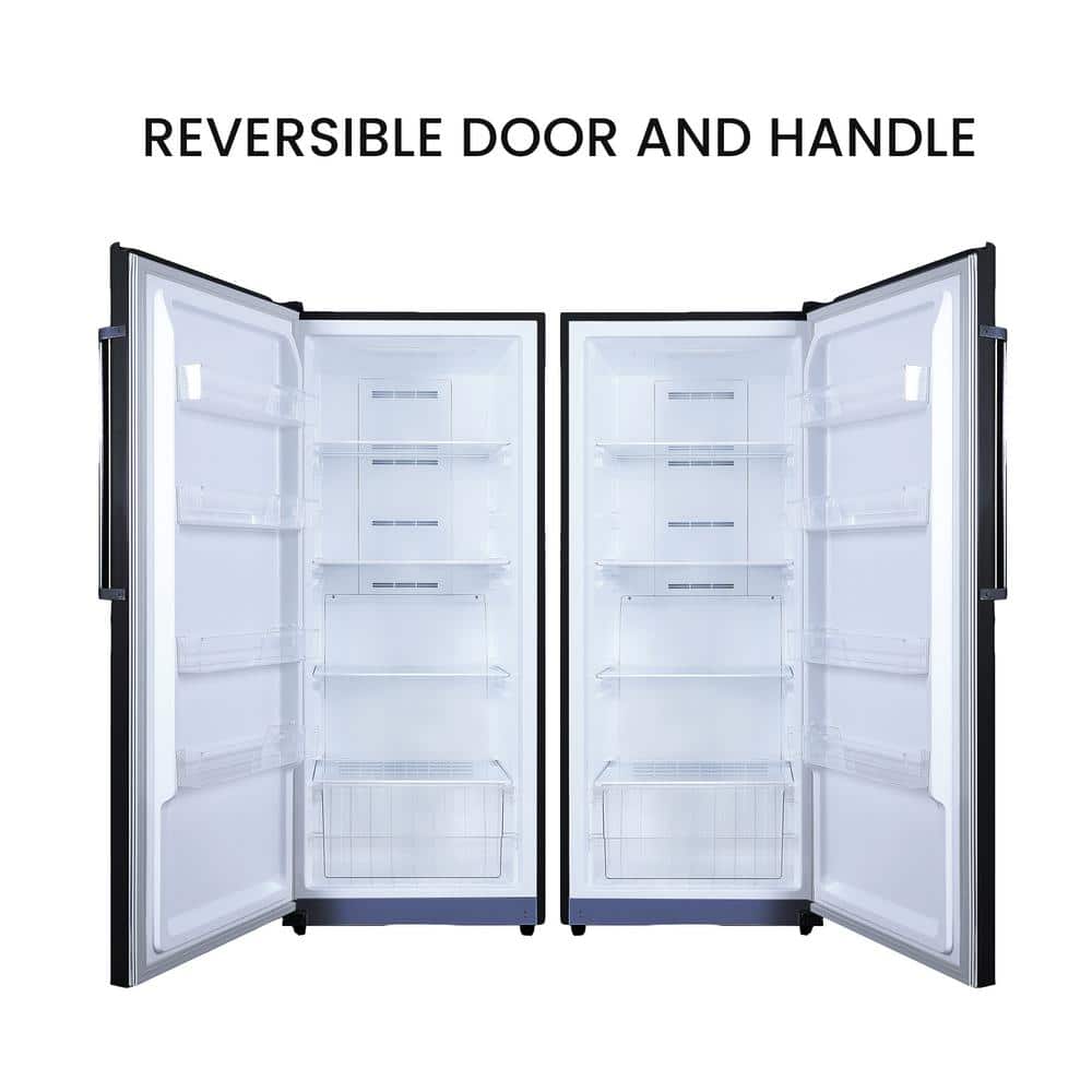 The ConServ FR1700 SREV Convertible Freezer-Refrigerator is the ultimate appliance, allowing you the flexibility to use it as either a refrigerator or a freezer, according to your needs. The feature-rich unit incorporates a cooling system that maintains uniform temperature and an alarm sound to remind you to fully close the door. The 17 cu. ft. unit, measuring 68 in. H x 28 in. W x 31.9 in. D, as well as 4-tempered glass shelves, 4-plastic door shelves and adjustable feet for easy access to your food. The convenient frost-free feature removes the worry of having to manually defrost the freezer. The electronic display panel on the door makes adjusting the temperature simple. Choosing the desired temperature is as easy as pressing up or down in the Choose Mode. Its premium stainless finish, external grip handle, LED lights and reversible door, along with the option to choose from 3 different colors such as white, black and stainless, make this Freezer-Refrigerator a sleek and ideal addition to your modern kitchen.