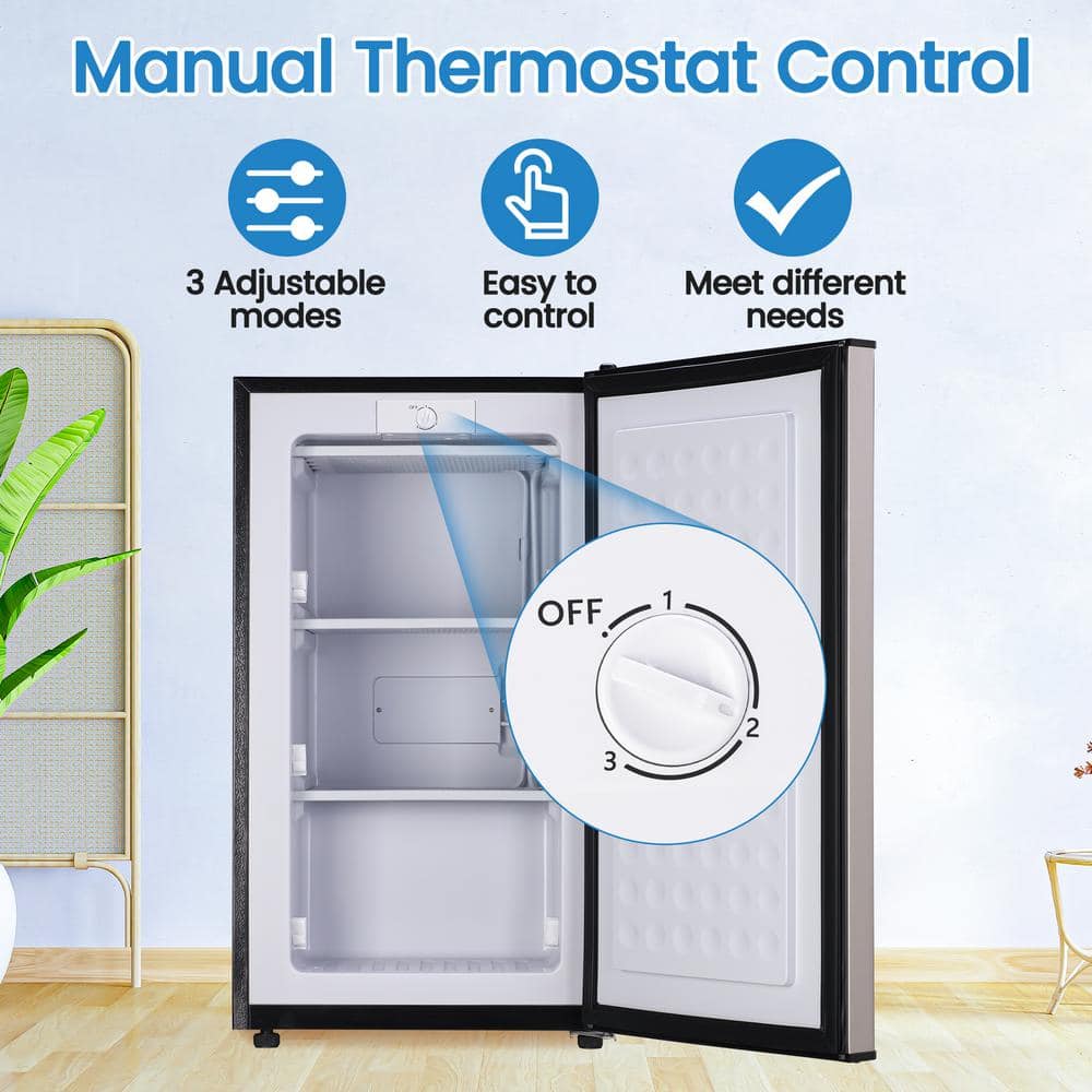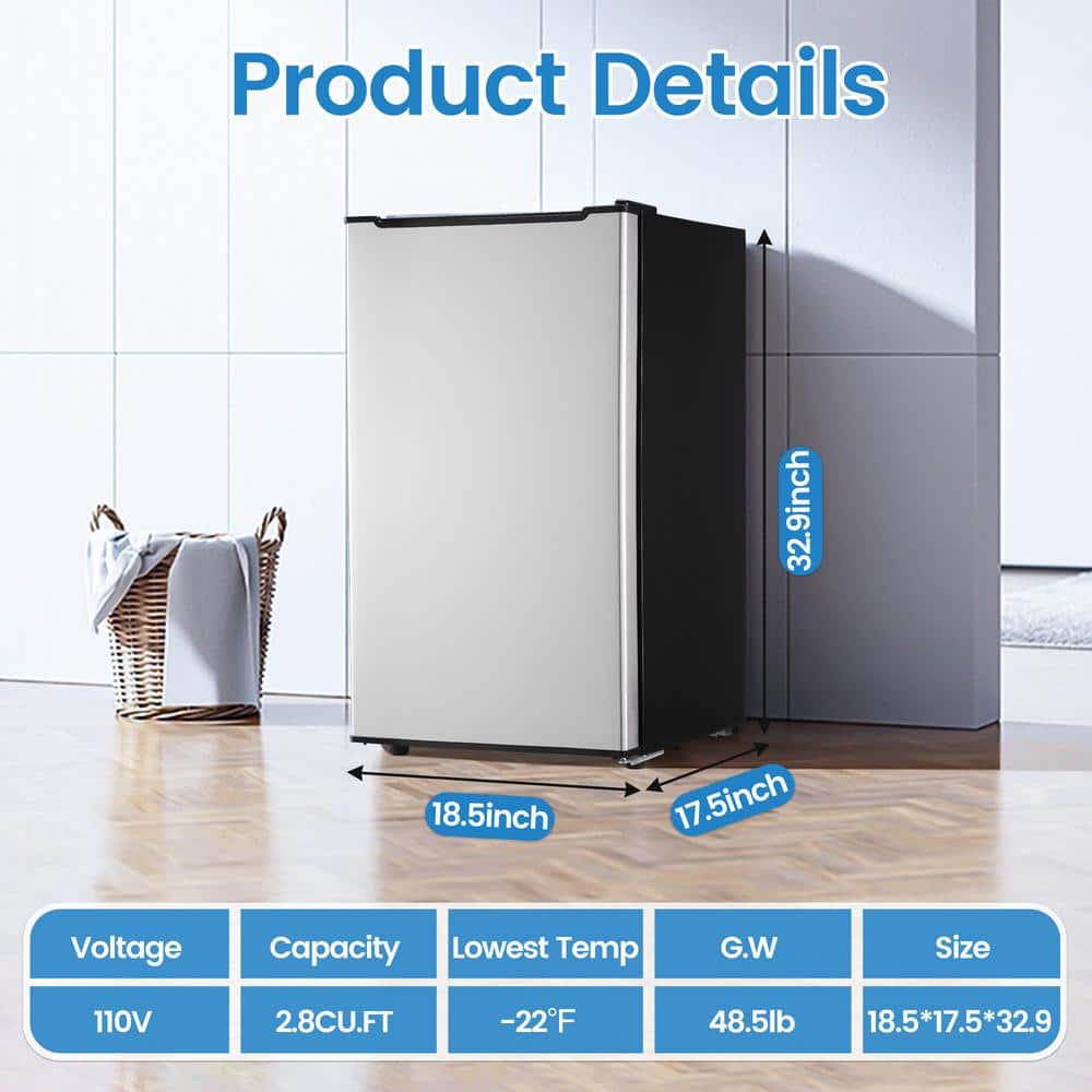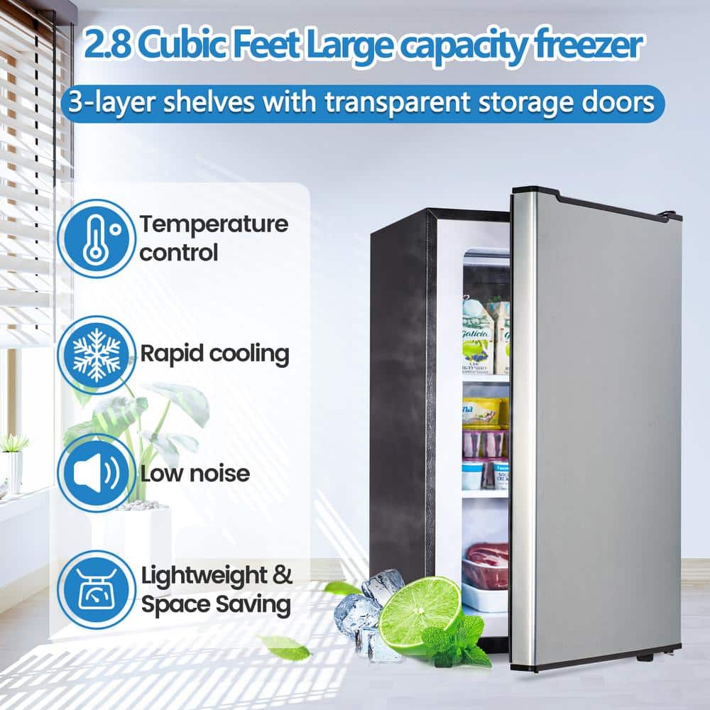 Keep your favorite food fresh with this 2.8 cu. ft. upright freezer. A compact design saves space while operating quietly at just 40 db. The high efficiency and low energy consumption compressor allows this chest freezer to cool swiftly for lower energy costs. With an adjustable three-grade temperature control on the back of the freezer, you can adjust it between -22 degrees F and 32 degrees F.