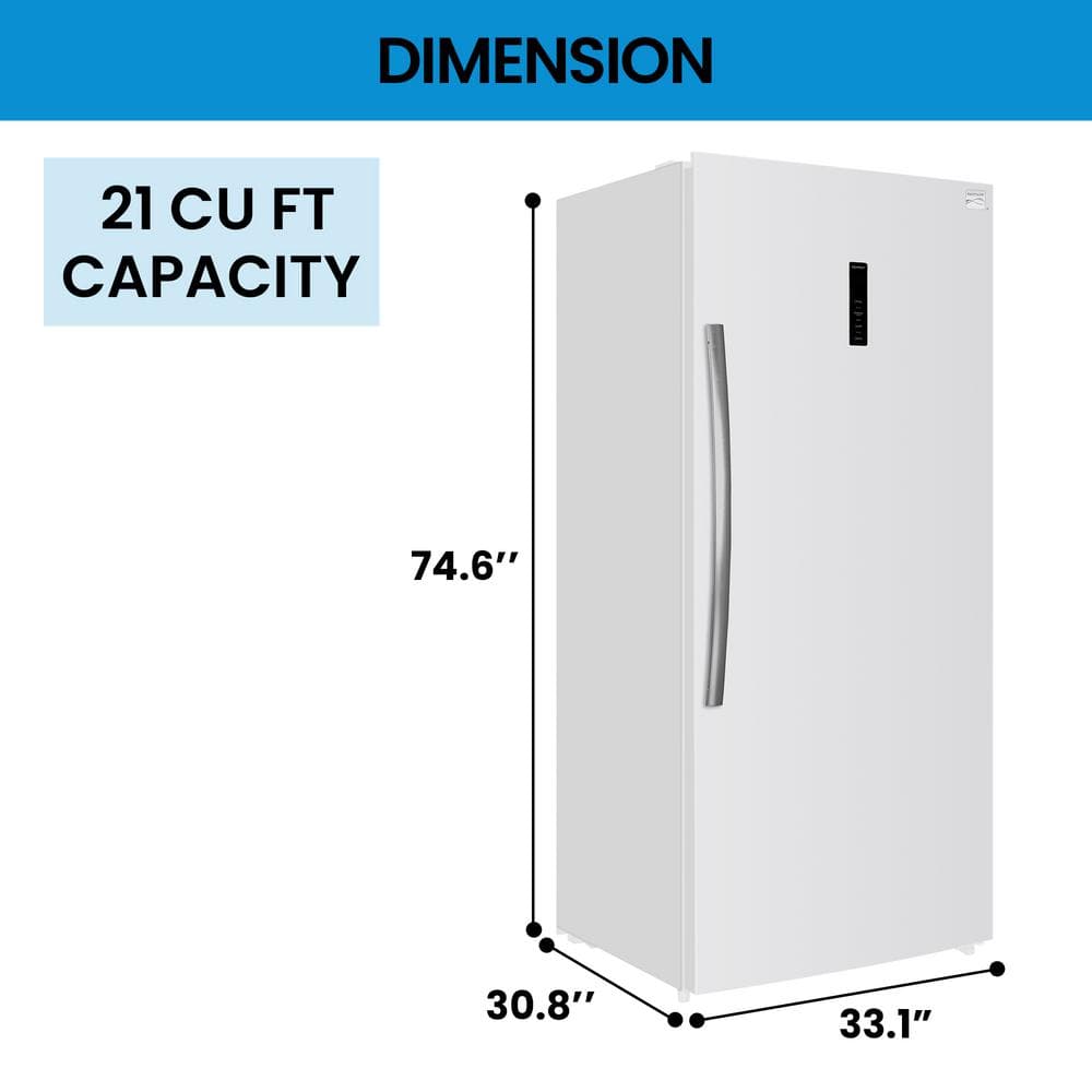 Space-saving 21 cu. ft. upright convertible refrigerator/freezer has user-friendly digital touch controls. EnergyStar-rated unit is garage-ready in freezer mode. Door storage bins and removable wire shelves accommodate all your food storage needs.