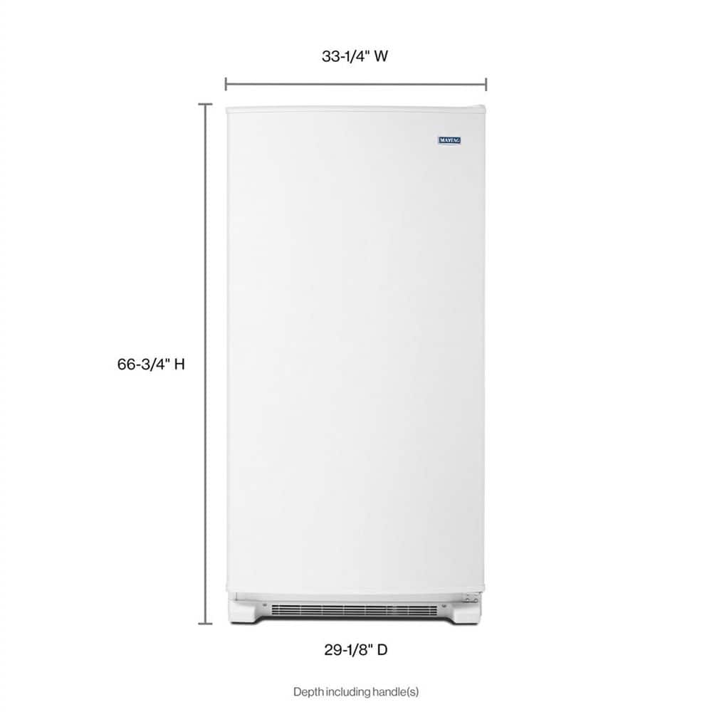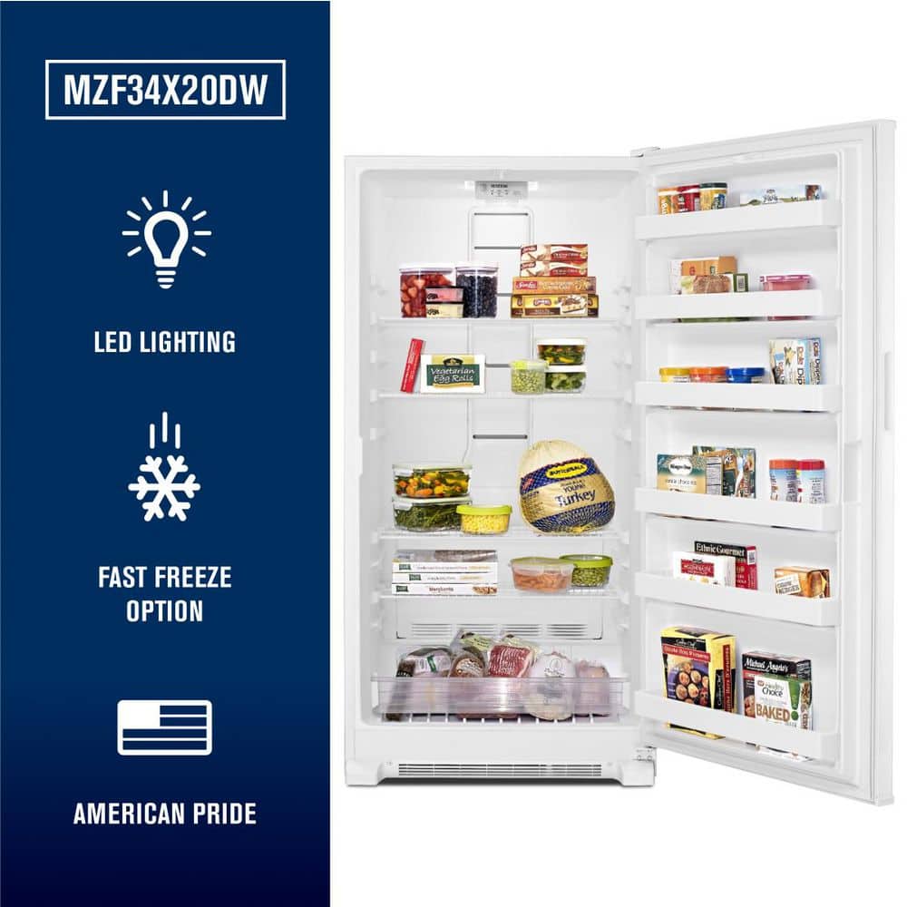 Maytag brand keeps your favorite frozen foods their chilly best with this spacious 20 cu. ft. upright freezer with bright LED lighting. Frost Free defrost prevents icy build-up and also helps you avoid the slushy mess of defrosting. The Fast Freeze option turns your upright freezer into a time capsule for food, lowering the freezer to it's coldest temperature for 24 hours to lock in flavor and freshness. Our 10-year limited parts warranty on the compressor guarantees that you can count on it to keep all your food frozen for years. In a Maytag upright freezer, food stays its best from grocery day until weeks later when that juicy roast and those crispy vegetables become a tasty meal for your family.