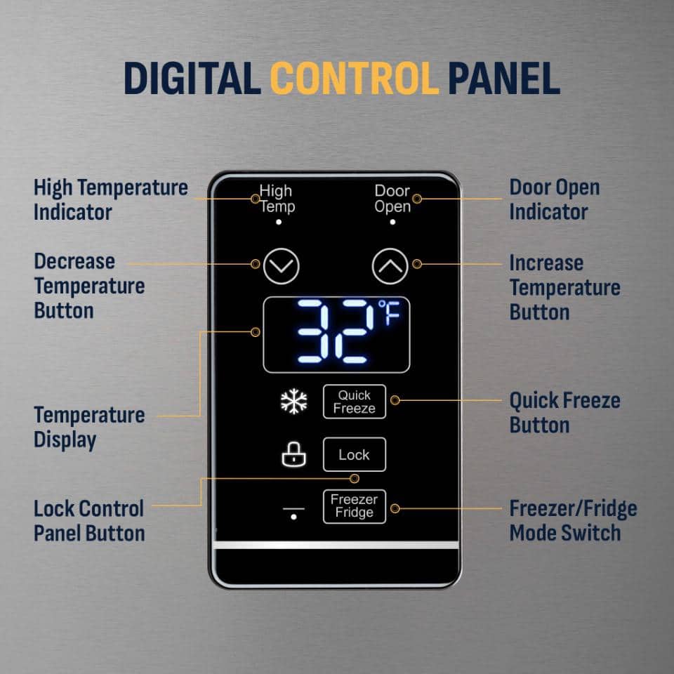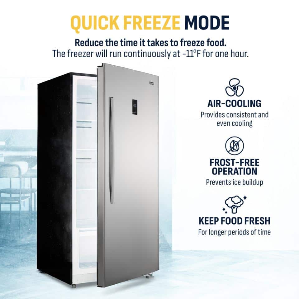 Introducing our durable upright freezer, built to withstand both the indoor heat or chill, making it perfect for garages and basements. With 13.8 cu. ft. of space and versatile storage options, this garage freezer provides ample room for all your perishables while minimizing its footprint. Equipped with intuitive digital controls and automatic defrosting, maintaining optimal freezing conditions is effortless, ensuring your food stays fresh and accessible.