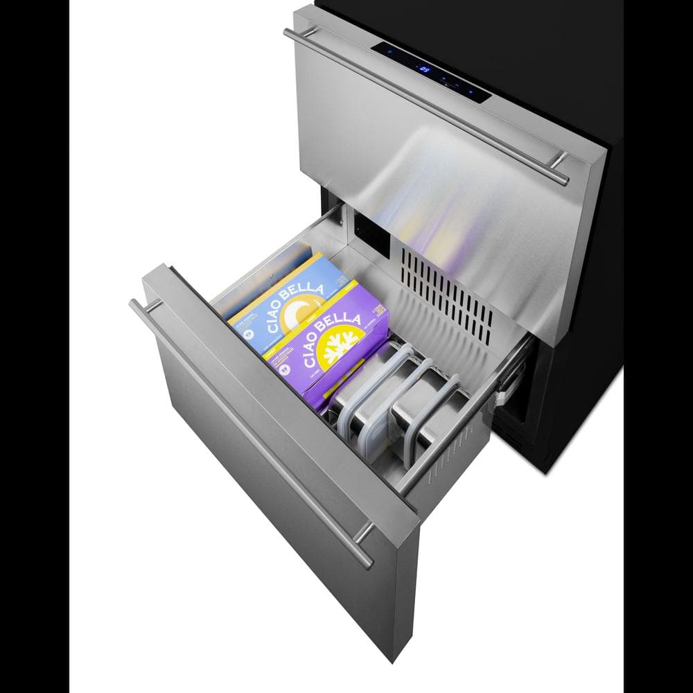 ADFD243 is a 2-drawer freezer perfectly designed for built-in or freestanding installation in ADA compliant settings with lower counter height. The fully finished black cabinet and stainless steel drawer fronts feature weatherproof construction for safe use in outdoor kitchens, with a sealed back to protect all components from the elements. The drawer fronts can also accept user-provided overlay panels to create a custom look that blends into existing cabinetry (panel dimensions: 23.43 in. W x 14.1 in. H at 3/4 in. thick).Inside, a generous 3.7 cu.ft. capacity accommodates your storage needs. Frost-free operation ensures minimal user maintenance, with fan-forced cooling to evenly distribute the temperature. A digital thermostat, located atop the upper drawer, makes it easy to manage the temperature, with an LED display that can be read in Celsius or Fahrenheit. Two adjustable, removable dividers allow you to separate the drawer compartments into two or four zones to easily accommodate a variety of sizes. A child lock will disable the digital controls after two minutes of inactivity to prevent accidental adjustments. An audible alarms for high-temperature fluctuations and open drawer alerts, a temporary memory function to recover all settings in the event of power loss, and sabbath mode to disable certain electrical features during periods of religious observance.The ADFD243 is ETL-S listed to NSF-7 commercial settings and also meets all residential standards for home use.