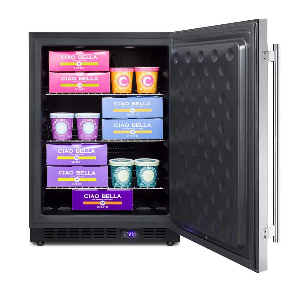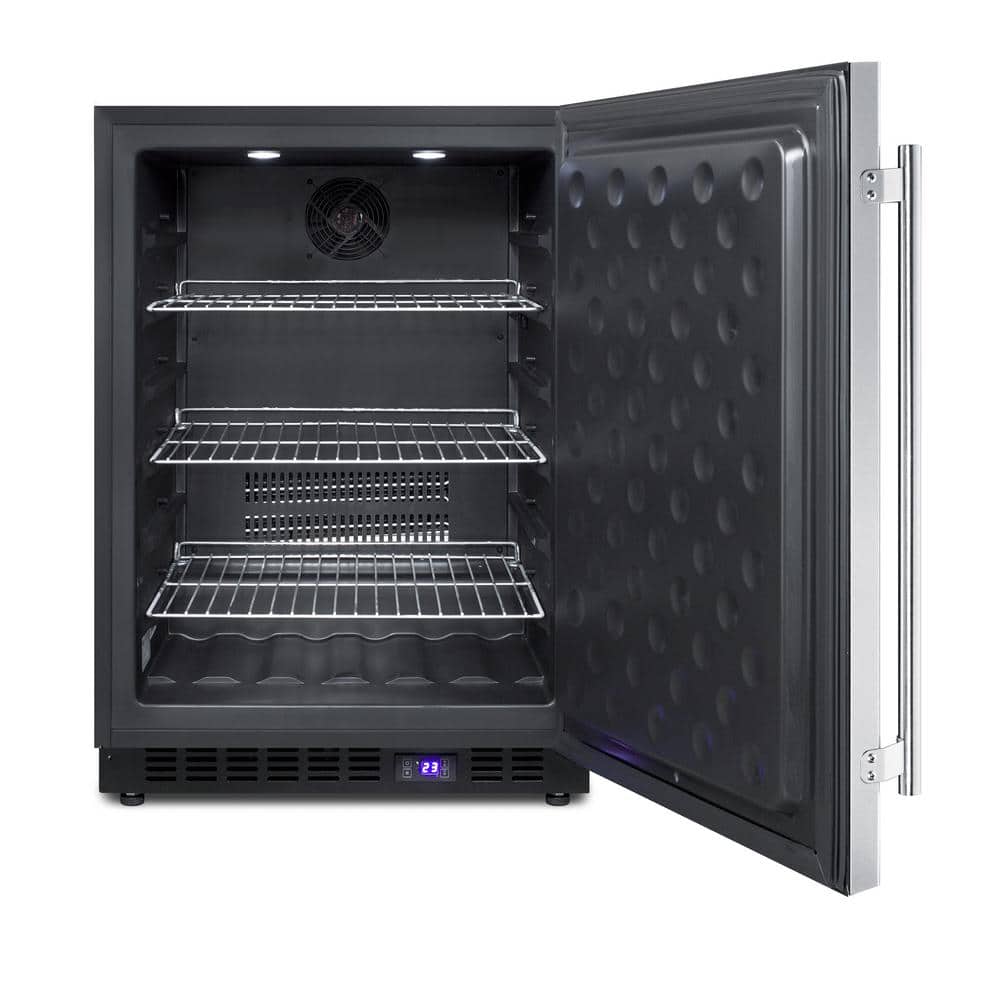 Summit's SCFF53B series brings quality and convenience under the counter with a fully featured lineup of built-in frost-free all-freezers. Sized with a convenient 24 in. footprint, the SCFF53BSS2 freezer can be used built-in or freestanding. It has a black cabinet with a sealed back for easy cleaning. The reversible stainless steel door includes a factory installed lock and a professional style handle. Inside, the SCFF53BSS2 utilizes frost-free operation with fan-forced cooling to ensure low maintenance and even temperature distribution. Recessed LED lighting offers an attractive yet efficient look. The digital thermostat makes it easy to manage the interior temperature. This unit includes adjustable chrome shelves for flexible storage. Additional features include an open door alarm, high temperature alarm and sabbath mode setting that lets you disable some of the electrical elements during periods of observance. The SCFF53BSS2 freezer is ETL-S listed to NSF-7 commercial standards. With its deluxe style and user-friendly features, this unit is the perfect choice for home or commercial kitchens.