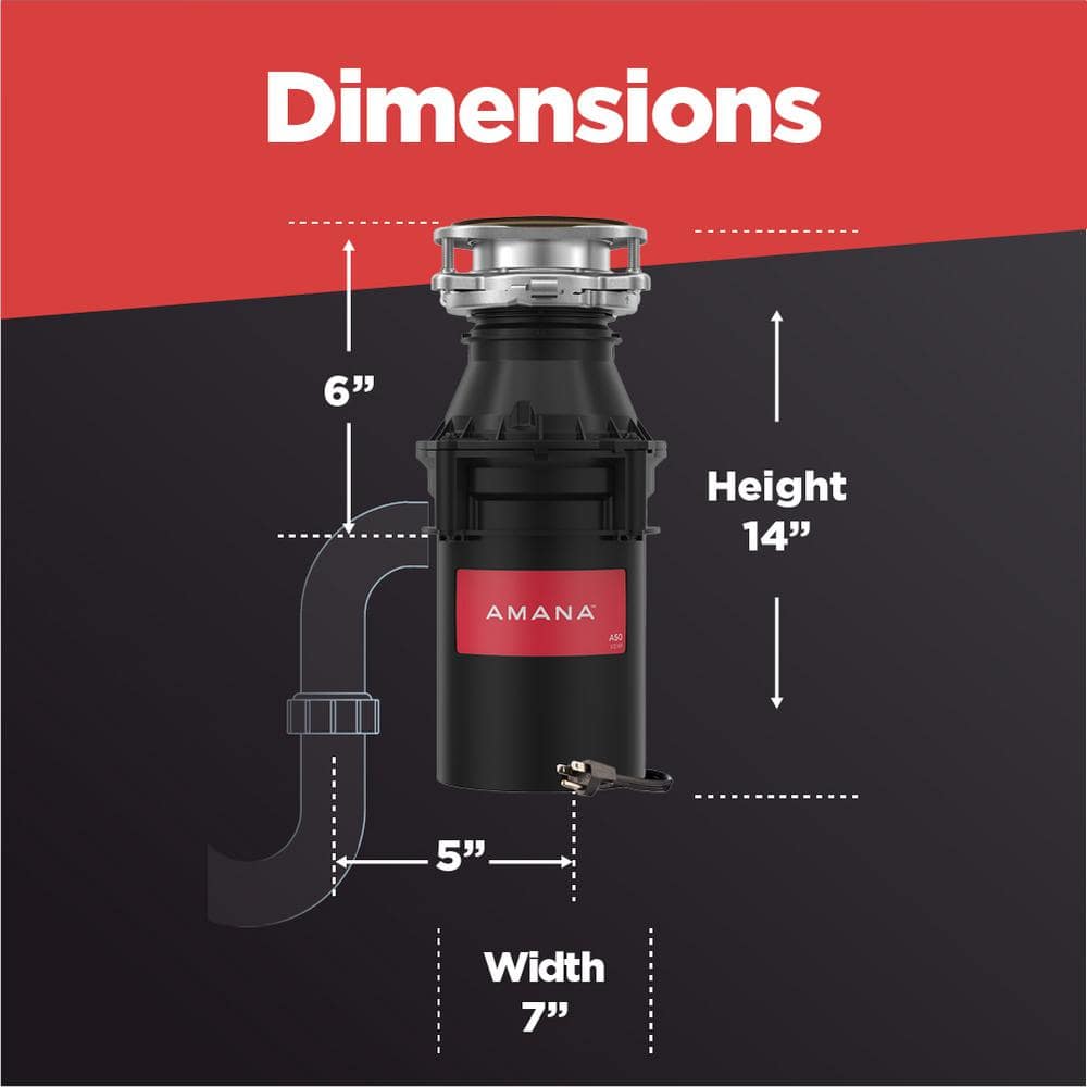 The Amana A50 1/2 HP Garbage Disposal with cord offers a convenient and environmentally responsible way to help rid your kitchen of everyday food scraps with its Single Stage Grind. Septic-safe for properly maintained septic systems and easily fitting under the kitchen sink, this garbage disposal has Grind Speed, quickly shredding food waste into fine particles that flush down the kitchen drain with ease. A functional and affordable choice for garbage disposals, the Amana A50 disposal with factory-installed power cord features a 1/2 HP MAGNADRIVE permanent magnet motor engineered to grind everyday kitchen food scraps reliably, along with 3D Grind Zone, a specially designed grind chamber that keeps food in the grind zone and directs water to rinse the chamber walls. It's also made with stainless steel lugs and galvanized steel grind components that are more than 12% heavier than leading permanent magnet motor brands. The rugged construction ensures a reliable grind with smooth, low-maintenance operation, and the design saves valuable under-sink space. This Amana garbage disposal is equipped with LIFT AND LATCH technology and a QUICK LOCK Mount compatible with most three-bolt mounting assemblies for simplified installation or disposal replacement. Life's complicated; your appliances shouldn't be. Amana: Just Right.Laboratory measurement of peak horsepower output of motor, not the operational output at the disposal.