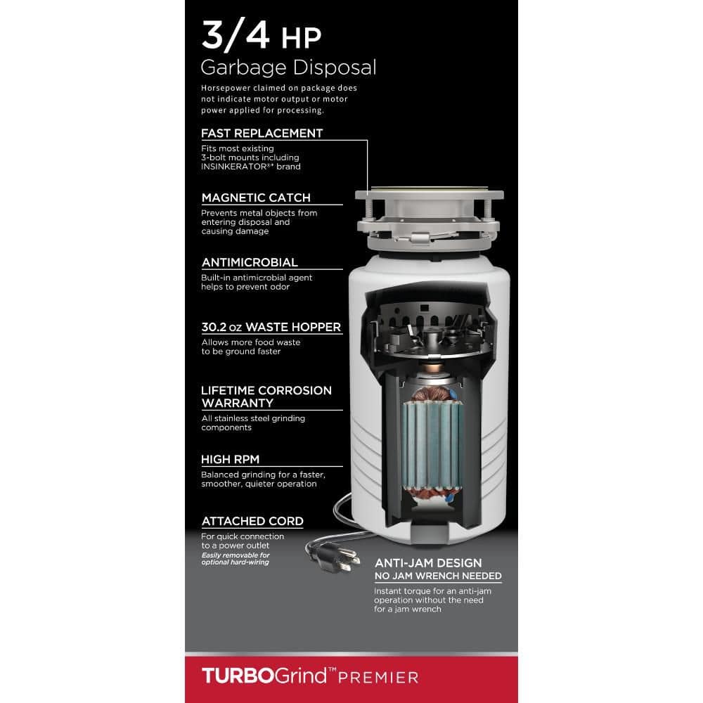 Glacier Bay TurboGrind Premier 3/4 hp. Continuous Feed Garbage Disposal with Power Cord