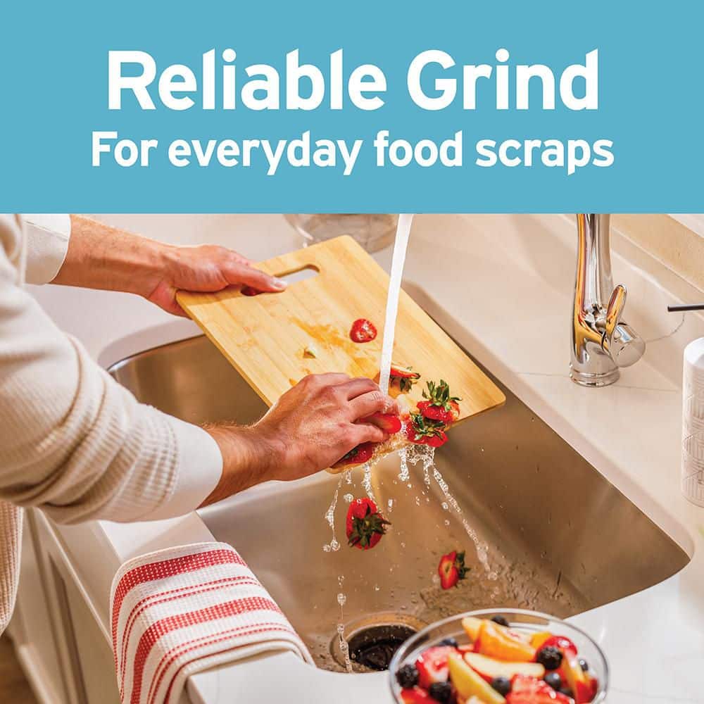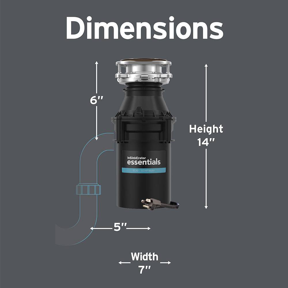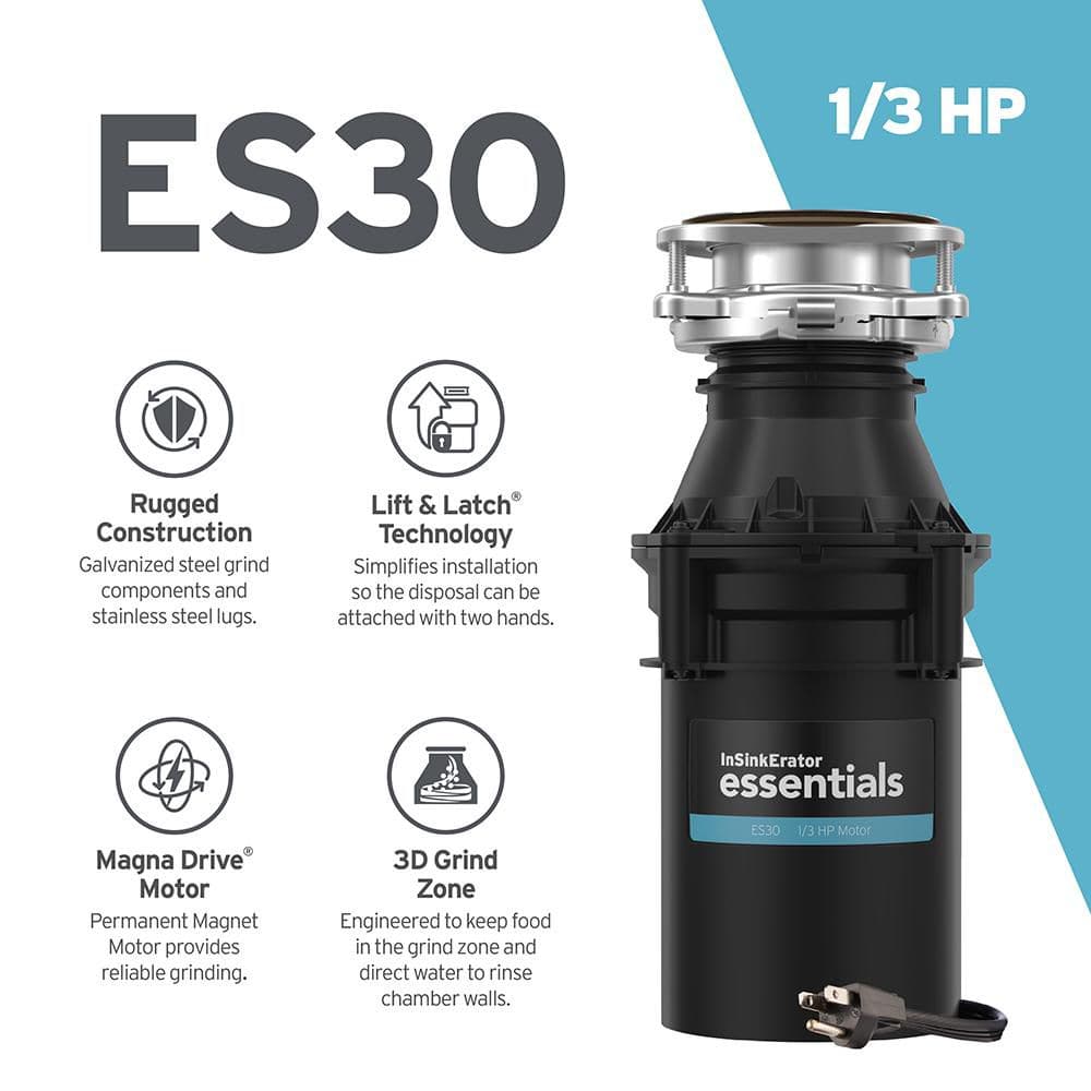 The InSinkErator Essentials ES30 1/3 HP Garbage Disposal with cord offers a convenient and environmentally responsible way to help rid your kitchen of everyday food scraps with its Single Stage Grind. Septic-safe for properly maintained septic systems and easily fitting under the kitchen sink, this garbage disposal quickly shreds food waste into fine particles that flush down the kitchen drain with ease. A functional and affordable choice for garbage disposals, the InSinkErator Essentials ES30 disposal with factory-installed power cord features a 1/3 HP MAGNADRIVE permanent magnet motor engineered to grind everyday kitchen food scraps reliably, along with 3D Grind Zone, a specially designed grind chamber that keeps food in the grind zone and directs water to rinse the chamber walls. It's also made with stainless steel lugs and galvanized steel grind components that are more than 12% heavier than leading permanent magnet motor brands. The rugged construction ensures a reliable grind with smooth, low-maintenance operation, and the design saves valuable under-sink space. This InSinkErator Essentials garbage disposal is equipped with LIFT AND LATCH technology and a QUICK LOCK Mount compatible with most 3-bolt mounting assemblies for simplified installation or disposal replacement. InSinkErator. KITCHEN BETTER.Laboratory measurement of peak horsepower output of motor, not the operational output at the disposal.