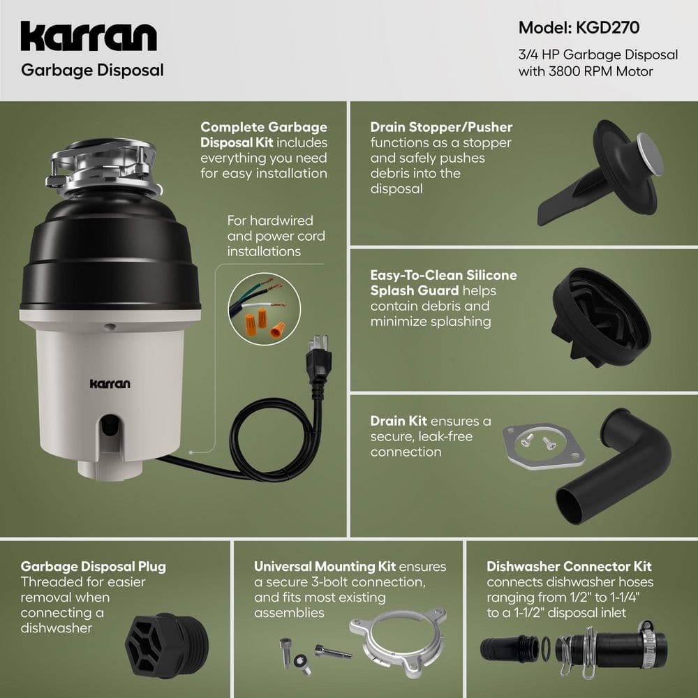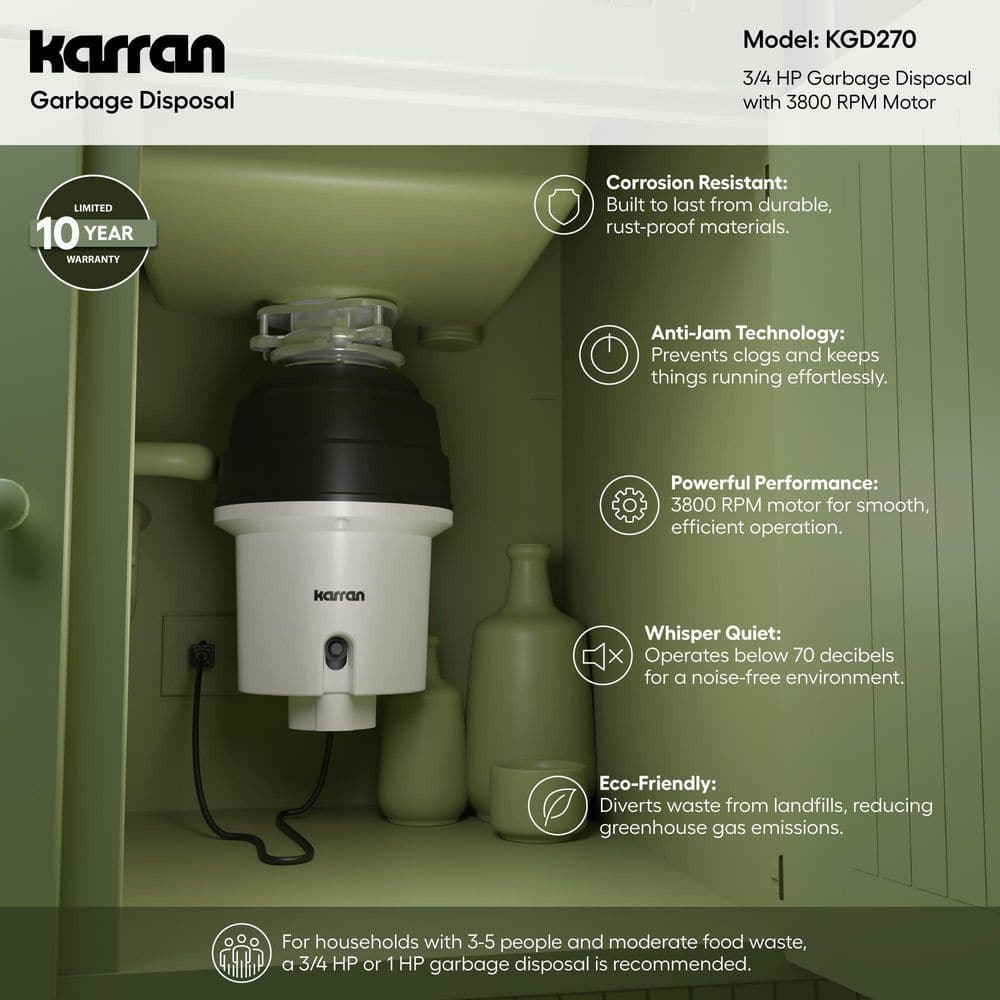 Karran 3/4 HP Continuous Feed Garbage Disposal with Power Cord