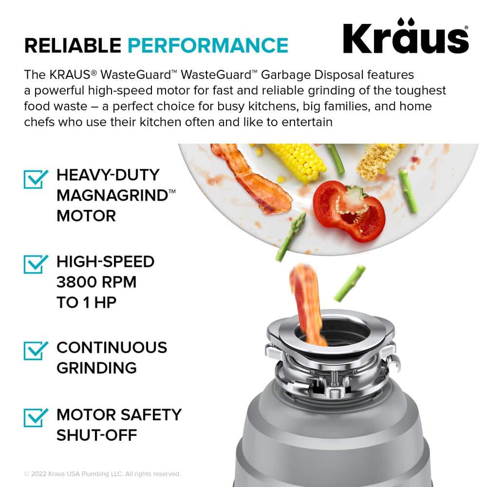 KRAUS Waste Guard High-Speed 1 HP Continuous Feed 3-Bolt Garbage Disposal with Power Cord and Flange Included