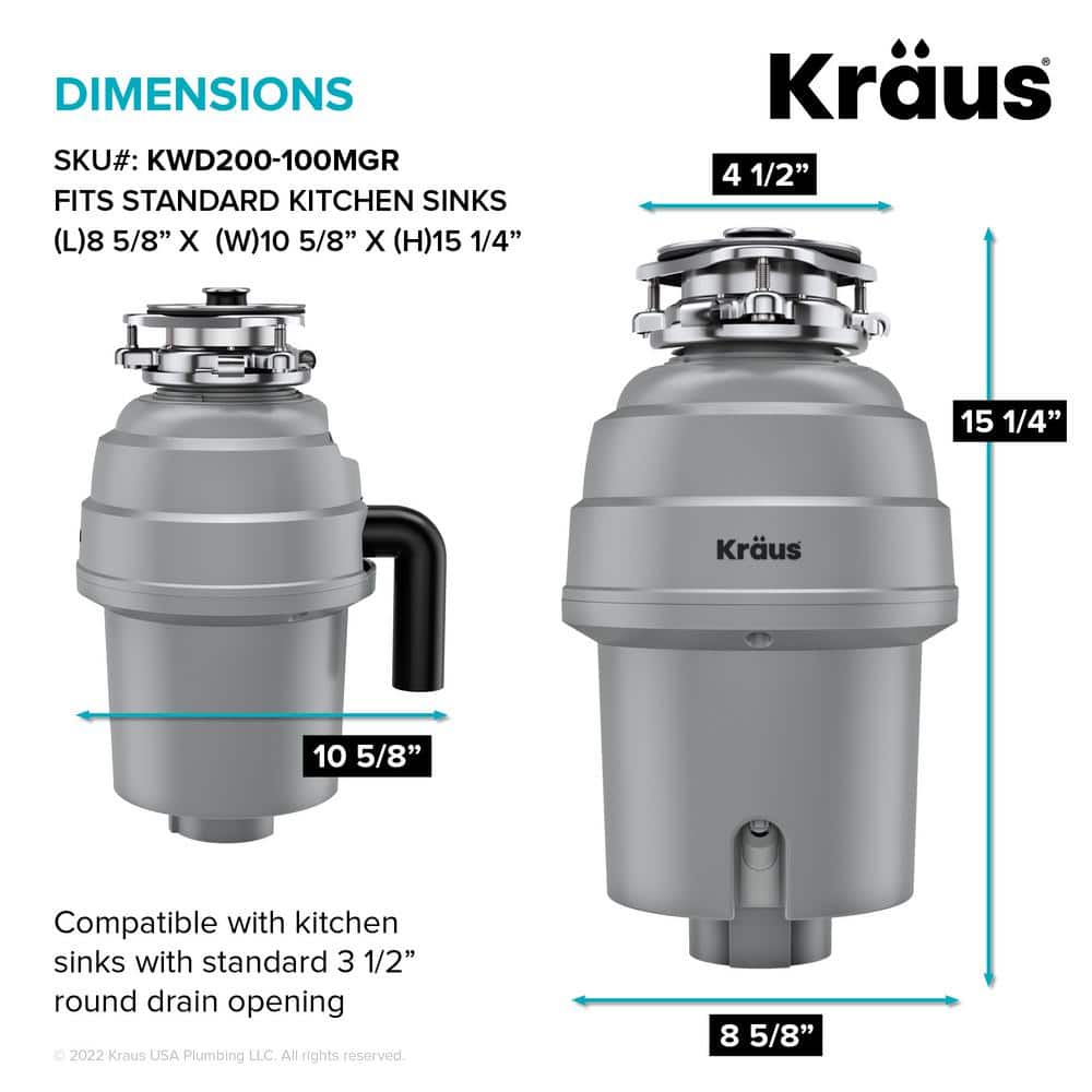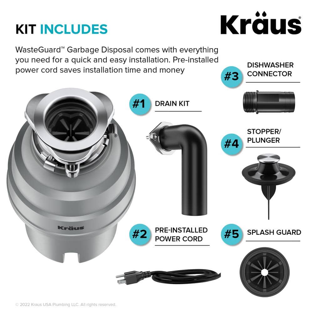 The KRAUS WasteGuard Garbage Disposal is perfect choice for big families with busy kitchens and home chefs that like to entertain. The heavy-duty high speed 3800 RPM 1 HP motor provides instant power for fast and reliable grinding of food waste. The continuous-feed sink disposal grinds waste into small particles, helping reduce the amount of food waste and garbage bags. Built with stainless steel components and ABS housing for lasting quality. Motor-saving shut-off technology helps prevent damage in case of blockage. Quiet Storm soundproofing technology and anti-vibration mounting system help ensure quiet operation. The 3-bolt mounting system matches most standard flanges so you can easily replace your old sink disposal. Includes power cord, flange and garbage disposal stopper.