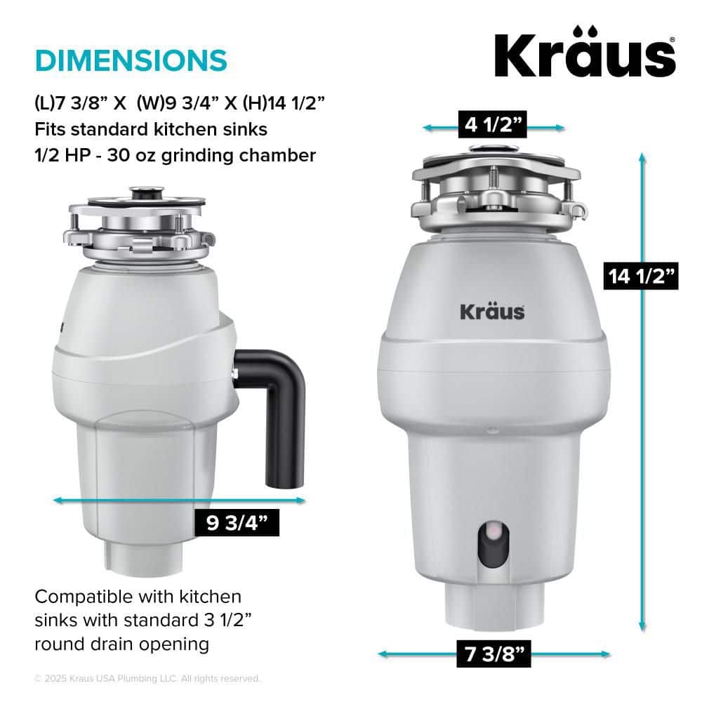 Make cleanup easy with a KRAUS WasteGuard Garbage Disposal, featuring a 3800 RPM MagnaGrind motor for fast, powerful operation. Available in 1/3 to 1 HP models for everything from light use to heavy-duty cleanup. Continuous-feed design lets you add waste while the sink disposal is running so you can clean as you go. Durable metal grinding components, QuietStorm soundproofing, and anti-vibration system help ensure lasting, quiet performance. Automatic shut-off with reset button protects motor during jams. Universal 3-bolt mounting with included power cord for plug-in installation or optional hardwiring. Garbage disposal for kitchen sinks comes with power cord, flange, and stopper/plunger. Septic-safe and eco-friendly, these garbage disposers help reduce the use of plastic trash bags.
