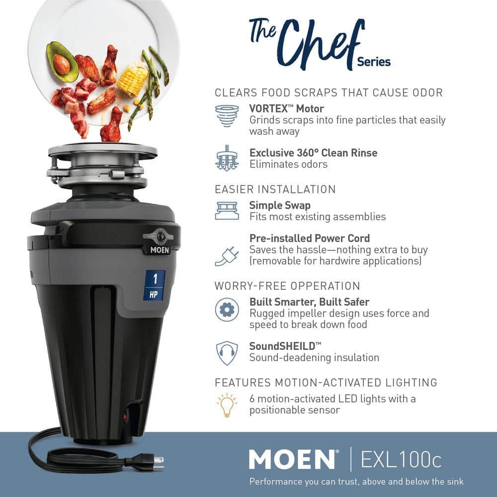 MOEN Chef Series 1-HP Continuous Feed Garbage Disposal with Integrated Lighting and Sound Reduction